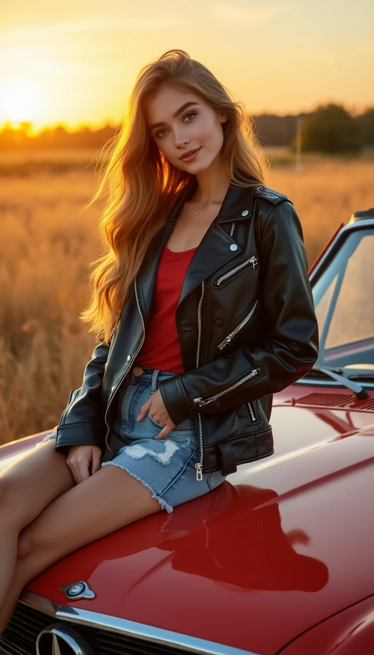 A young woman sitting on the hood of a red vintage car in an open field, wearing a black leather jacket and a red top, with a confident and relaxed expression, during sunset, in the style of a summer vacation ad, bright and cheerful, warm color palette