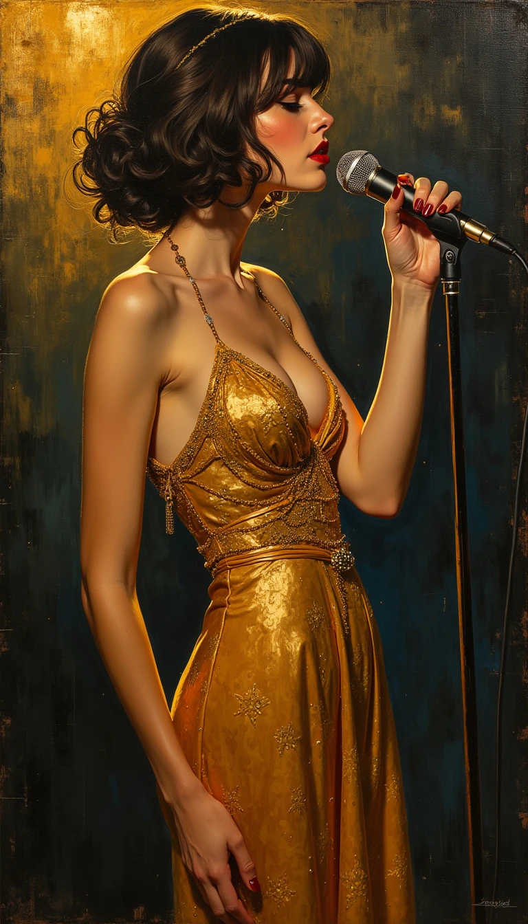 A very beautiful young woman in a golden dress. She's a singer. She sings on the nightclub stage. The spotlight falls on her. She is not wearing sleeveless clothes. She looks dangerous and gentle at the same time. She sings the blues. The painting is painted in the style of comic noir. It looks like an oil painting by Gustav Klimt.