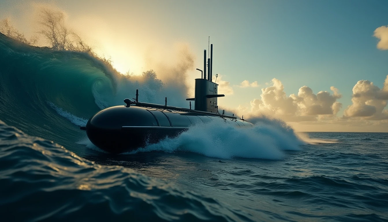 underwater photography of a small modern submarine beneath the big waves, high sea, open sea, waves, cinematic, golden hour, side view
