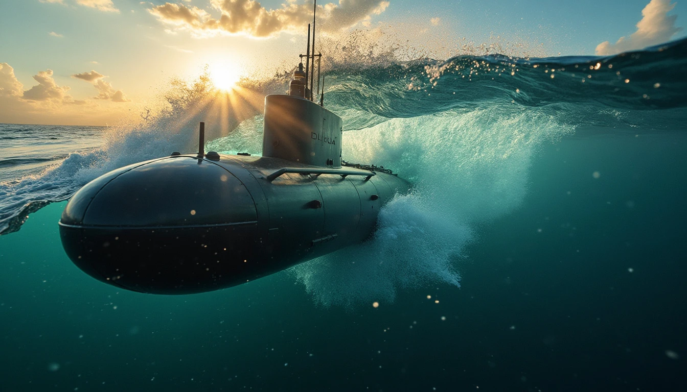 underwater photography of a small modern submarine beneath the waves of high sea, high sea, open sea, waves, cinematic, golden hour, side view