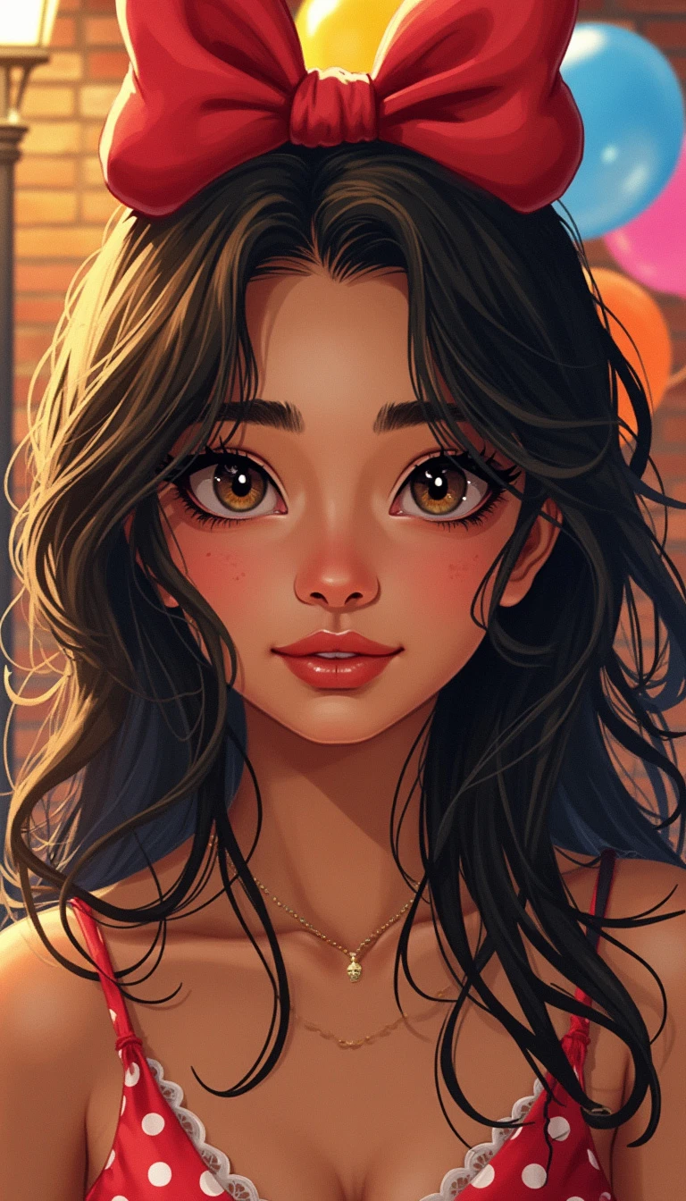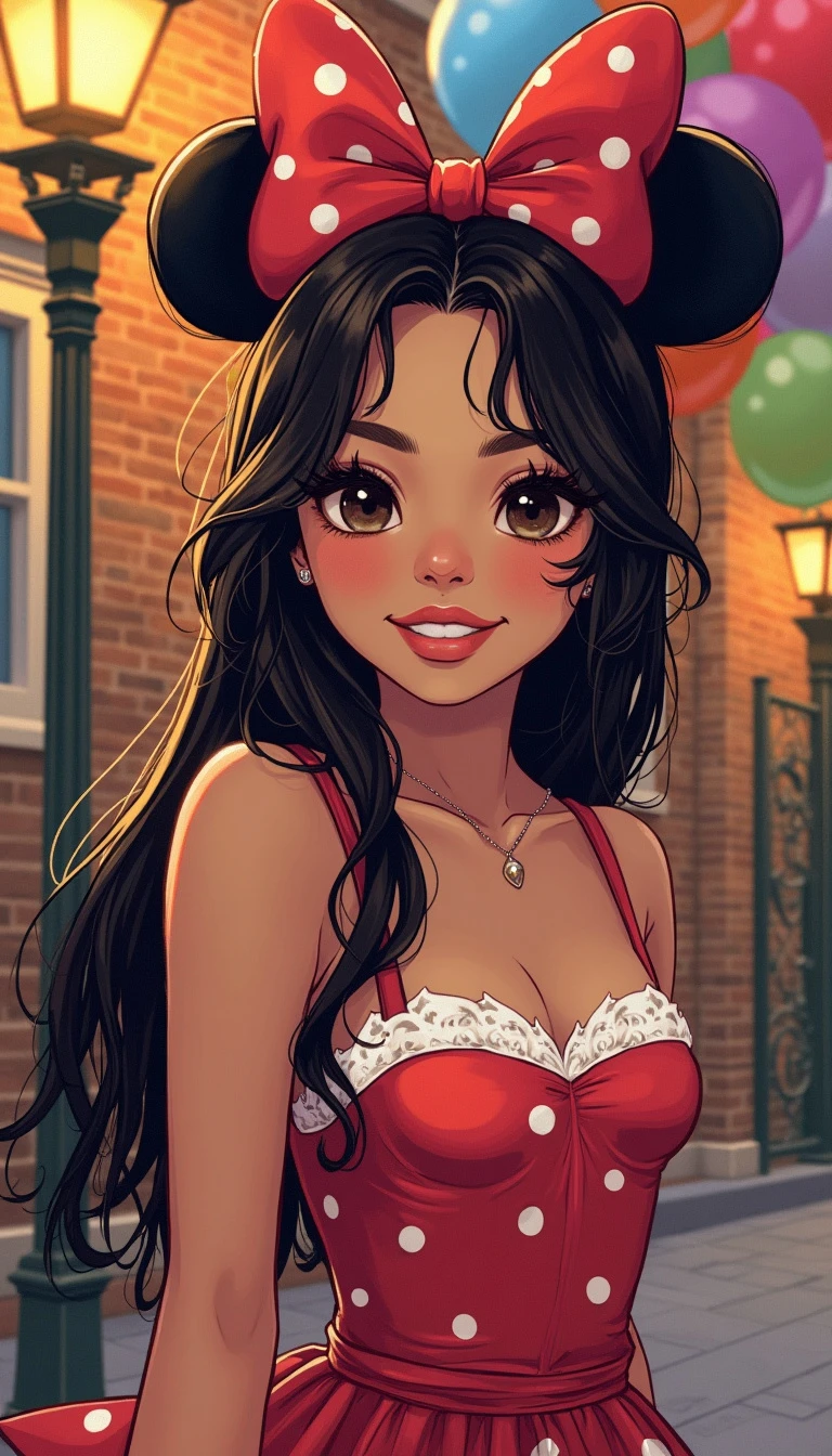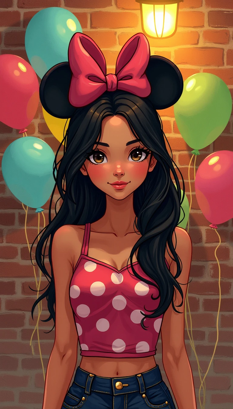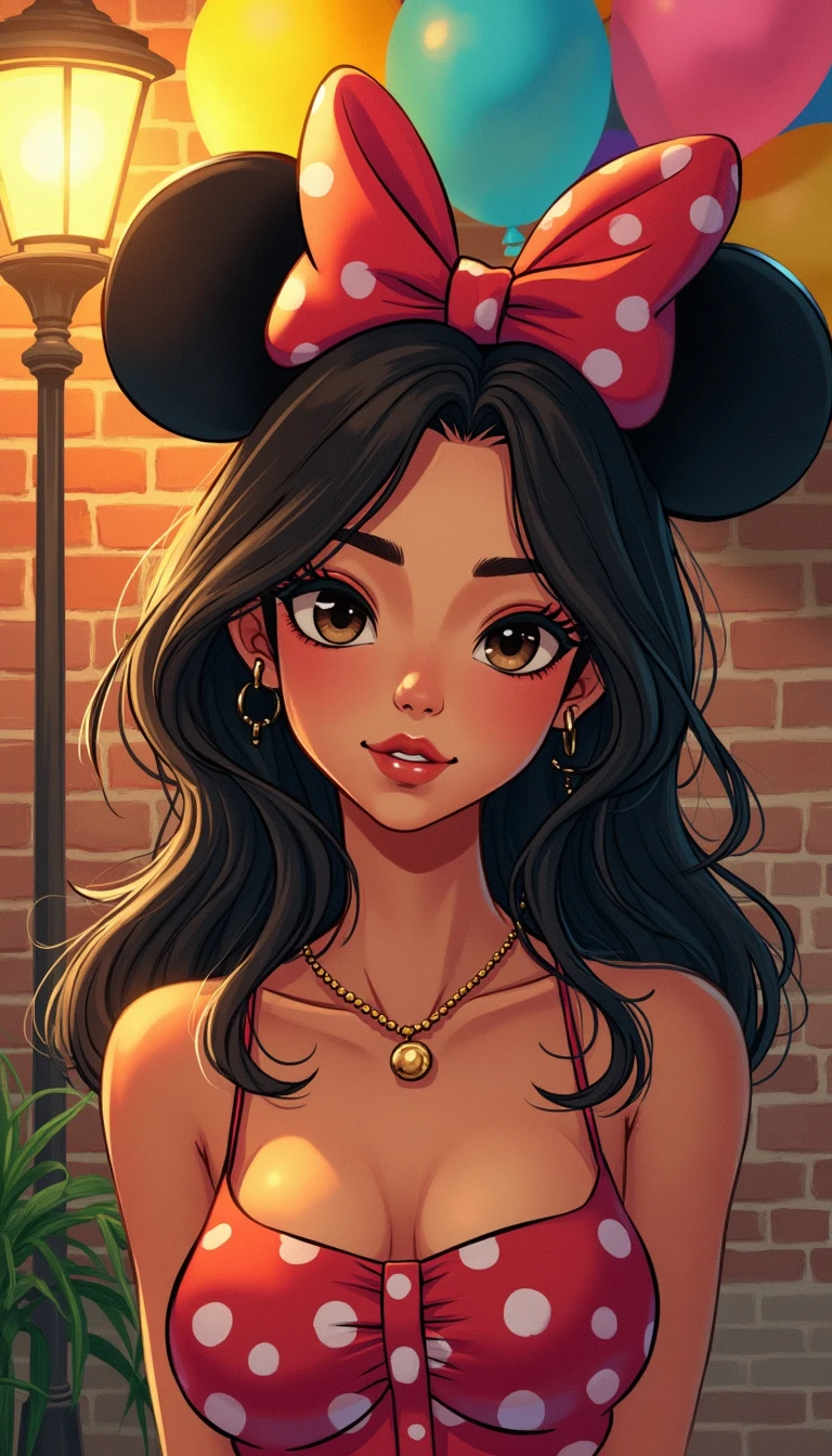 Grainy texture. European Features. Seinen Manga. Digital art manga. Flat shading. Fantasy. Vanessa Hudgens is the model. She is hispanic with tan skin and dark brown hair, but the face of Vanessa Hudgens.as Minnie Mouse. The background is cheerful with colorful balloons. The background is a brick wall under a streetlamp.
