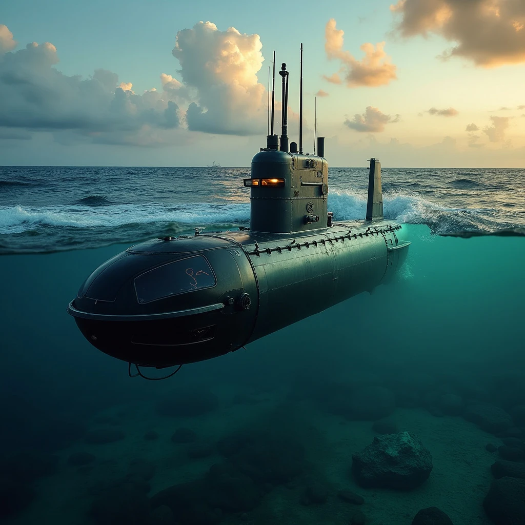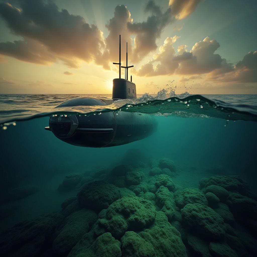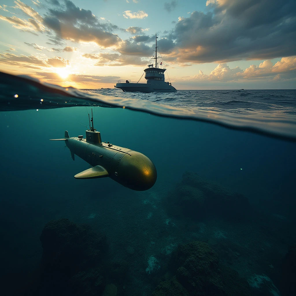 underwater photography of a small modern submarine scanning the ocean floor, in the style of Elena Kalis and Shawn Heinrichs, high sea, open sea, waves, cinematic, golden hour, side view