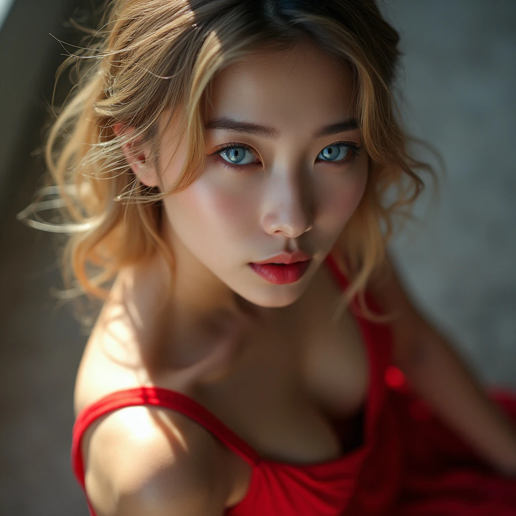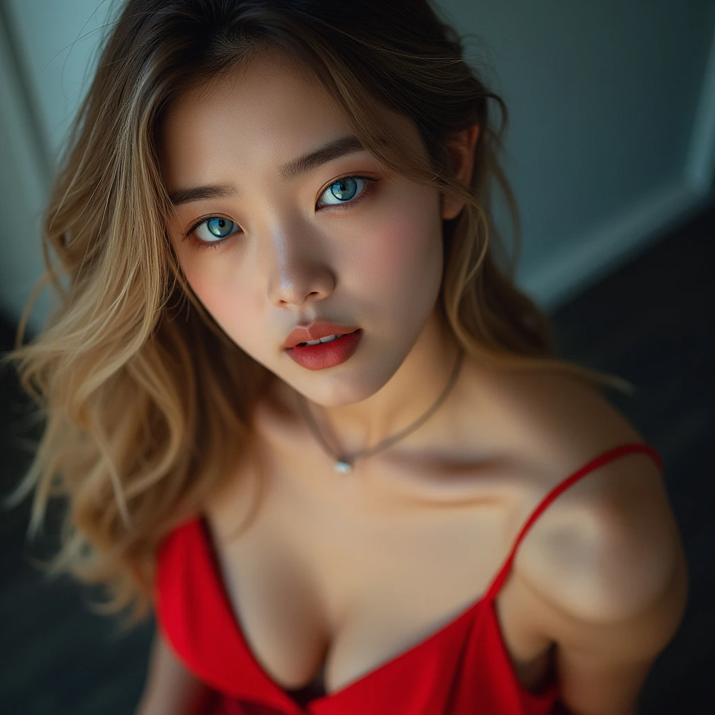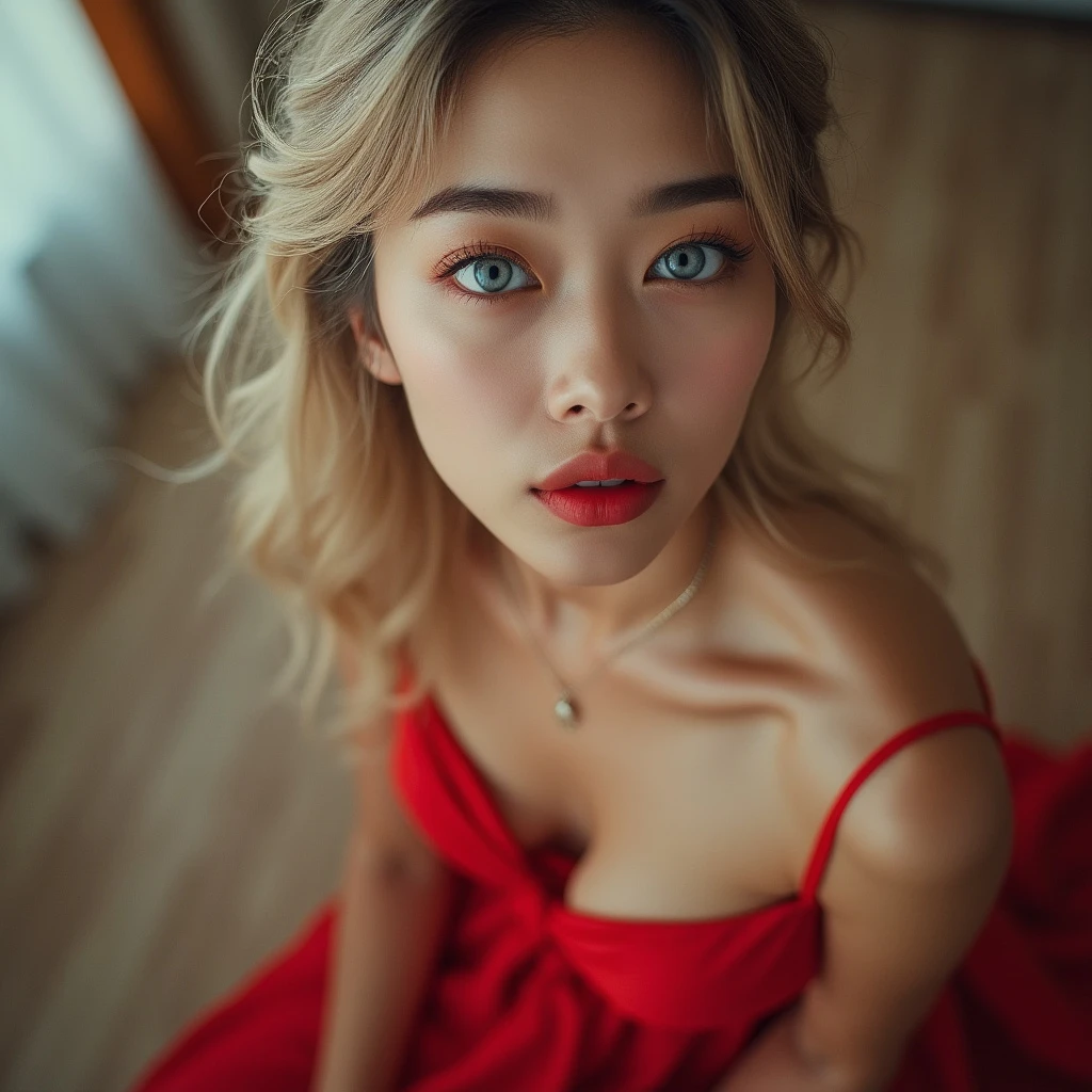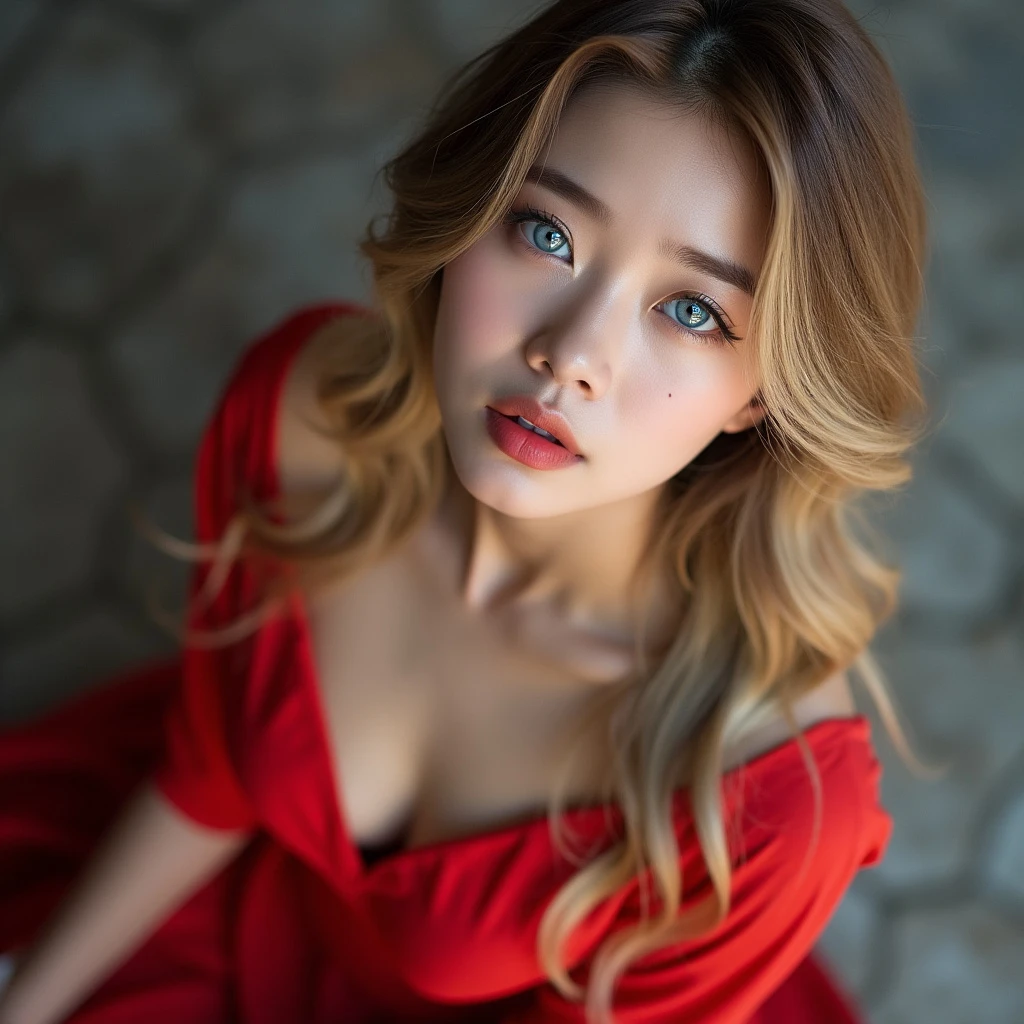 A High Angle photograph of a 21 year old Asian woman, korean k-pop star, gorgeous blue eyes, wearing red heartline dress looking up at camera, blonde streaks in hair. perfect Instagram photo lighting .