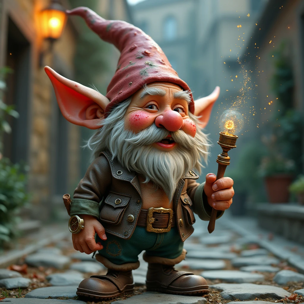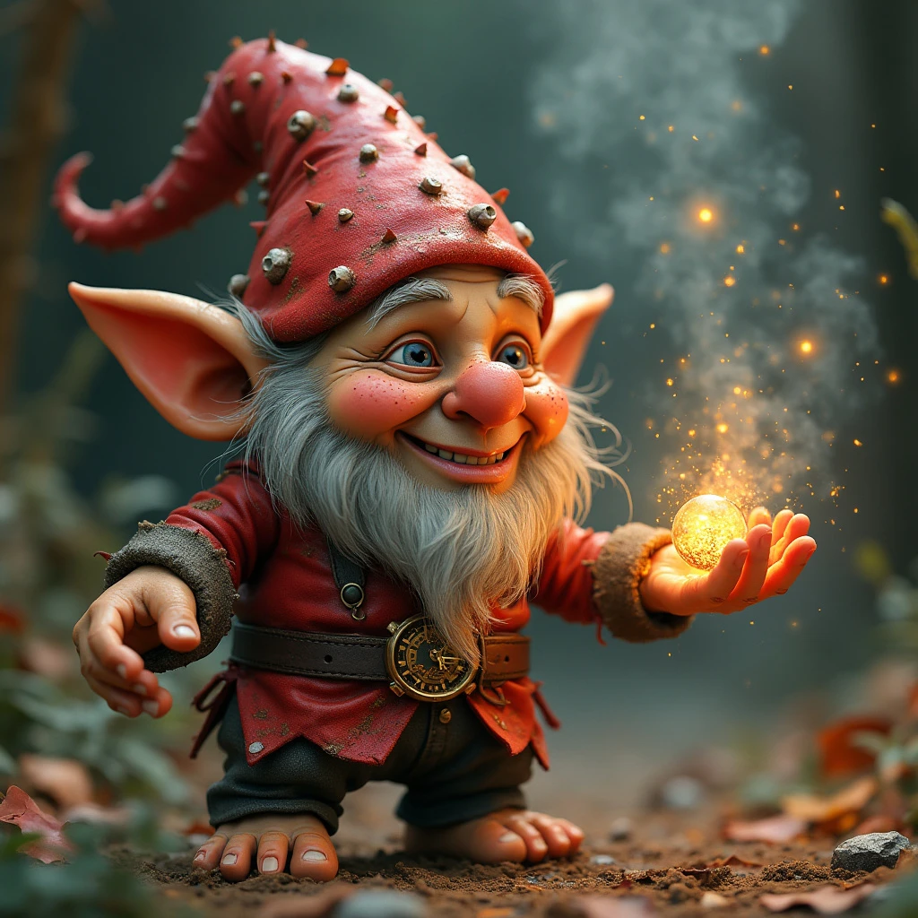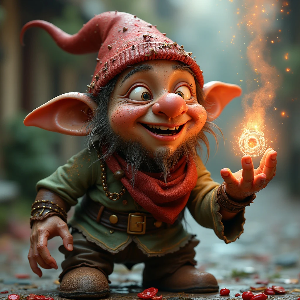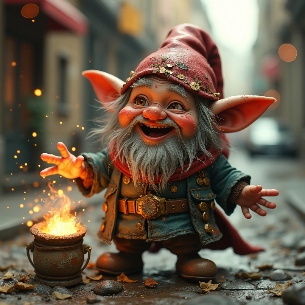 A small stinky gnome conjures magic and from this magic is formed 3d text "Dyada Roma", the gnome is very cheerful and all in pimples, he is dressed in tattered rags but on his hand is a very expensive watch, behind expensive cars and beautiful girls