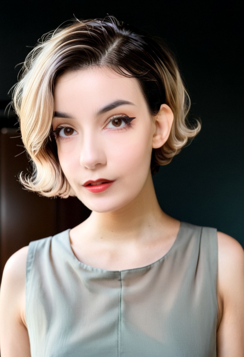 22 yrs Beautiful woman, ultra short french bob haircut, right hair part, side of head shaved, side shave, Flowing pastel sleeveless gown, (close-up, editorial photograph), [[Wide-angle photo]], (background inside dark, moody, private study:1.3), full body portrait, by lee jeffries, nikon d850, film stock photograph, 4 kodak portra 400, camera f1.6 lens, rich colors, hyper realistic, lifelike texture, dramatic lighting, velvia 50, eye contact, faint smile, wavy short french bob hair, 1920s hairstyle, short wavy hair, french bob, wavy pixie cut hair, wavy pixie hair, short black wavy hair, very short wavy hair, short french bob, bowlcut hair, shaved nape, shaved undercut, side shave, soft makeup, Dark Hazel eyes, Eye contact, pretty young woman in her 20's,