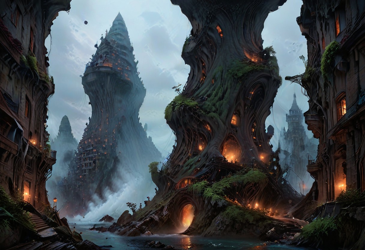 Surreal Harmony, otclillsn, FRESHIDEAS Real Photography 2#, dark, chiaroscuro, low-key , (High quality, Highly detailed, Sharp focus, 8K UHD, Hasselblad H6D-50c, Art photography:1.3), Amidst a darkness so profound it seems to have a palpable presence, an otherworldly metropolis emerges like a twisted, nightmarish labyrinth. Towering spires of obsidian rise from a sea of tenebrous mist, their impossible angles and curves warping the very fabric of reality. The air is heavy with an unsettling energy, as if the architecture itself is alive and exuding malevolent intent. Shadows writhe like living tendrils, casting an eerie glow on the twisted, cyclopean structures that seem to defy the laws of physics and sanity.