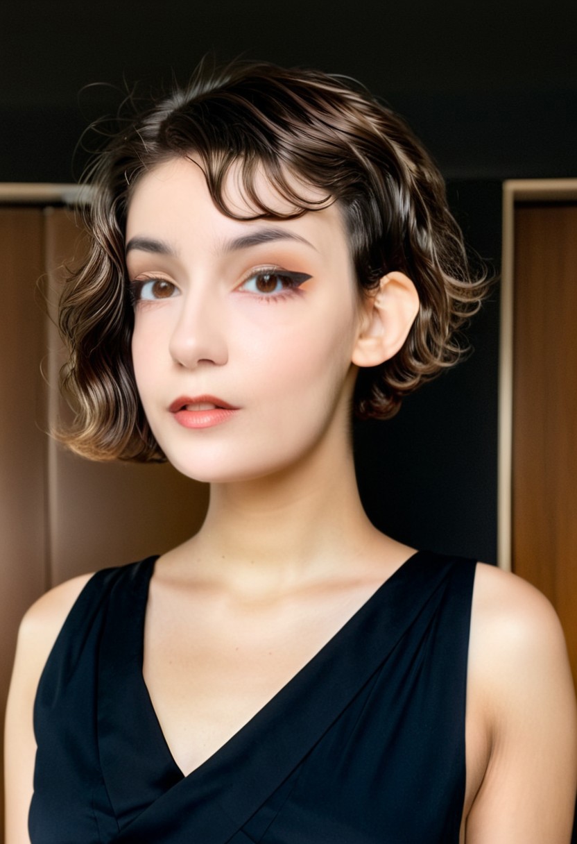 22 yrs Beautiful woman, ultra short french bob haircut, right hair part, side of head shaved, side shave, undercut, side shaved undercut, Flowing pastel sleeveless gown, (close-up, editorial photograph), [[Wide-angle photo]], (background inside dark, moody, private study:1.3), full body portrait, by lee jeffries, nikon d850, film stock photograph, 4 kodak portra 400, camera f1.6 lens, rich colors, hyper realistic, lifelike texture, dramatic lighting, velvia 50, eye contact, faint smile, wavy short french bob hair, 1920s hairstyle, short wavy hair, french bob, wavy pixie cut hair, wavy pixie hair, short black wavy hair, very short wavy hair, short french bob, bowlcut hair, shaved nape, shaved undercut, side shave, soft makeup, Dark Hazel eyes, Eye contact, pretty young woman in her 20's,