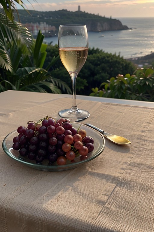close-up of a champagne glass with red grapes next to it on a table. A small yellow bird is also resting on the table, looking at the glass. In the background, there is a very large leaf, and the rest of the background shows the sea and distant mountains. The entire scene is bathed in sunset colors, which heavily influence the overall atmosphere.