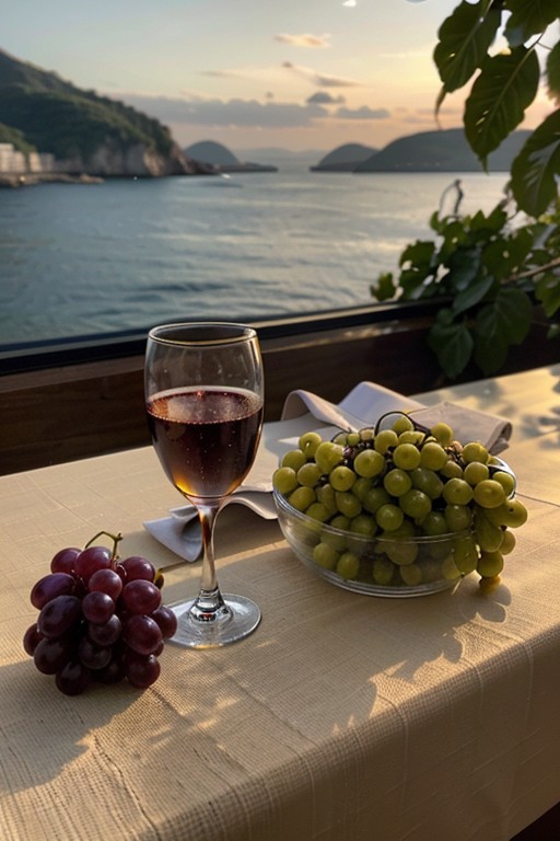 close-up of a champagne glass ,red grapes next to it on a table. (A small yellow bird is also resting on the table, looking at the glass:1.1). In the background, there is a very large leaf, and the rest of the background shows the sea and distant mountains. The entire scene is bathed in yellow sunset colors, which heavily influence the overall atmosphere.