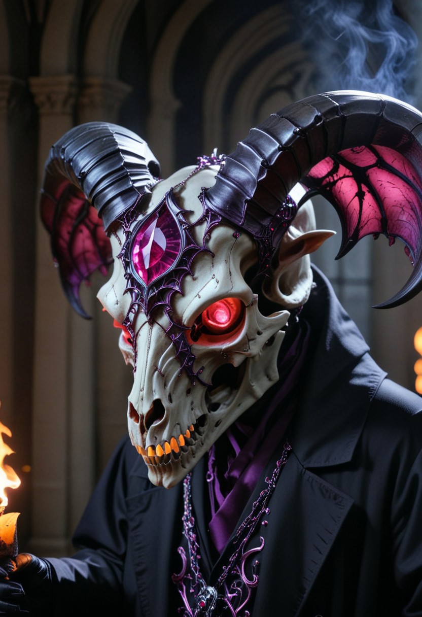 8k, uhd , photograph ((quality, intricate details, Mystical light. Fog. The feminine demon curves horns (bizarre chaotic horns) (dark purple glass wings) (appearance: evil but mystical) (ormate robes that seem made of shiny black satin with pink stitches), (a glowing crystal ) (black goat skull), (magic gems), (Bioluminescent Glow), (glowing holographic sigils), (Red eyes), (macabre evil megachurch), (blending the mechanical with the magical), (flaming torches), Perfect Composition, gothic horror) [ (intricately detailed), (very detailed background), (full-length photograph), (photograph taken from a distance), ( Photographer Martin Kimbell Style), (double-exposures), (alternate reality)]