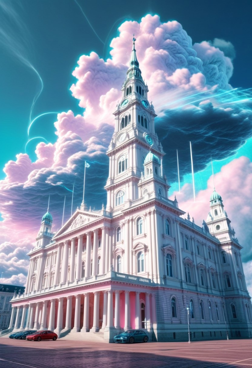 (masterpiece, best quality, high quality), oil painting, wide angle, (TOWN HALL:1.2) (powerful clouds) (vaporwave aesthetic:1.2), Bugs the politician, <lora:DonM3t3rn1tyXL-v1.1:0.7>, DonM3t3rn1tyXL, OverallDetailXL <lora:MJ52:0.3> <lora:SDXLFaeTastic2400:0.4> <lora:EpicF4nta5yXL:0.7>