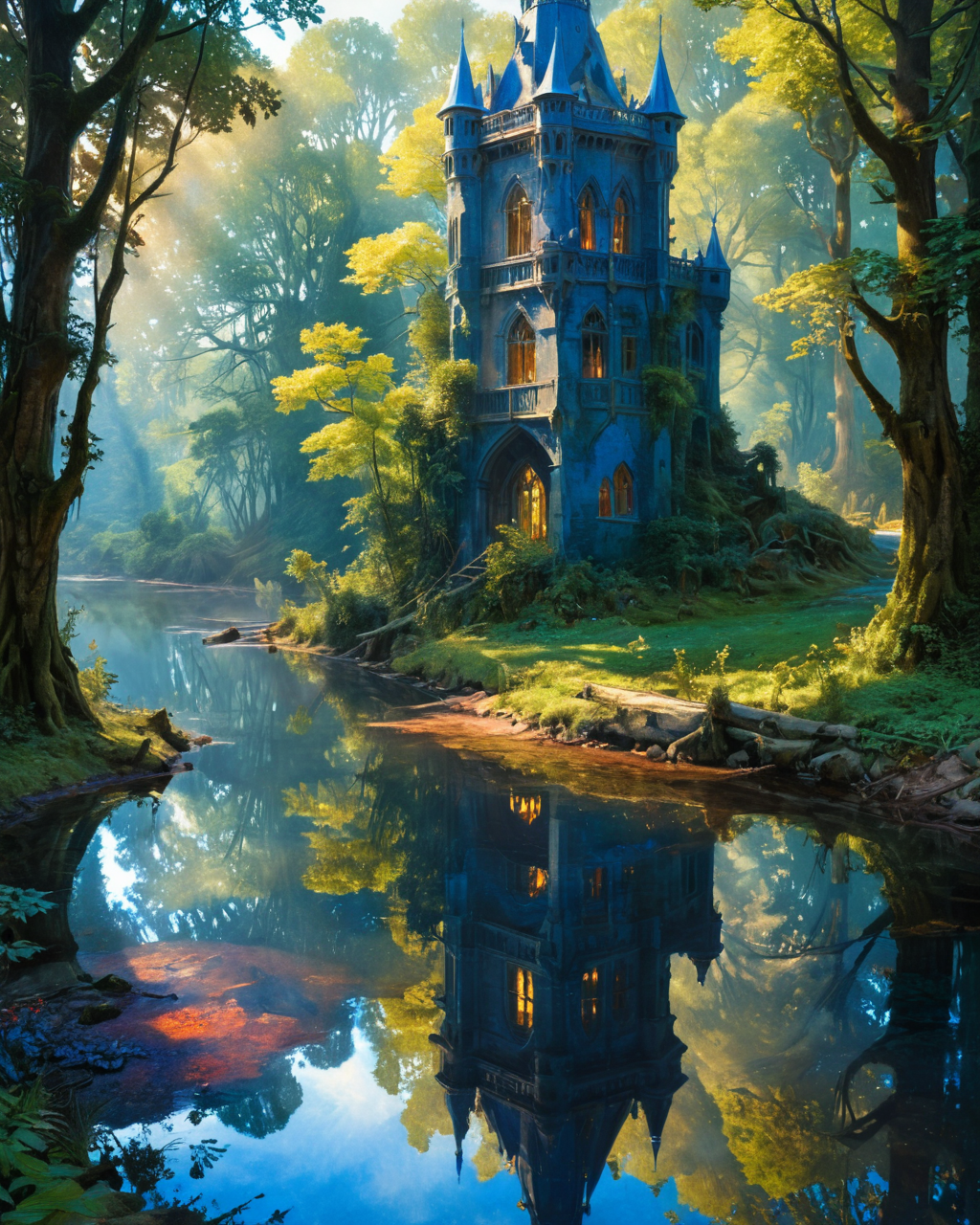 proud princess, forest, water, reflections, transparency, indigo, slimy, vivid color, The Tower of Shadows, Edgar Maxence, neon, <lora:add-detail-xl:1>, <lora:xl_more_art-full_v1:0.8>