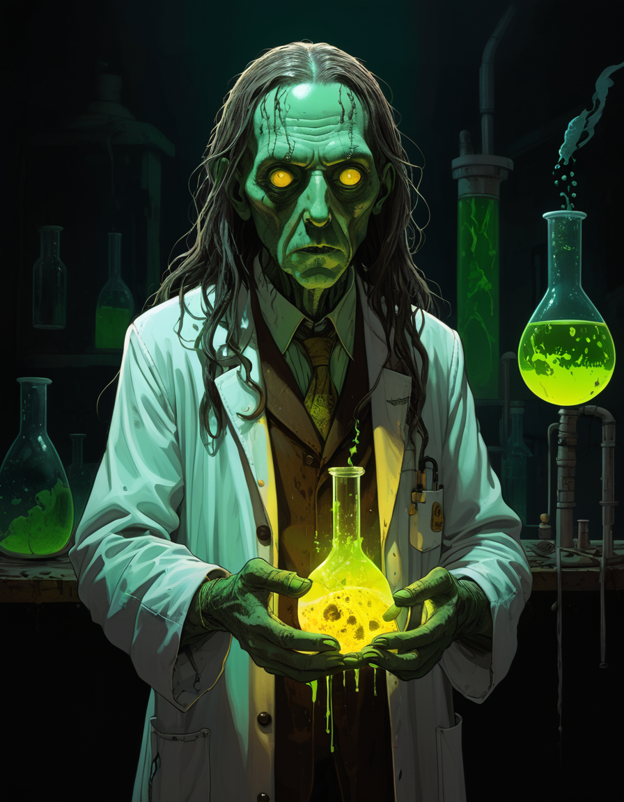 A cursed alchemist with sickly green skin, glowing yellow eyes, long greasy hair, dressed in a tattered lab coat stained with various substances, hands mutated, dripping with toxic chemicals, aura of madness and corruption, alchemical horror, digital art, inspired by H.P. Lovecraft, cosmic horror style, cluttered laboratory, sickly green and brown tones, unsettling and grotesque mood in the style of moebius <lora:- SDXL - vanta-black_contrast_V3.0:0.5> <lora:Moebius (Jean Giraud) Style:0.6> Moebius (Jean Giraud) Style page <lora:zavy-cntrst-sdxl:0.5> dark, chiaroscuro, low-key <lora:add-detail-xl:0.65>