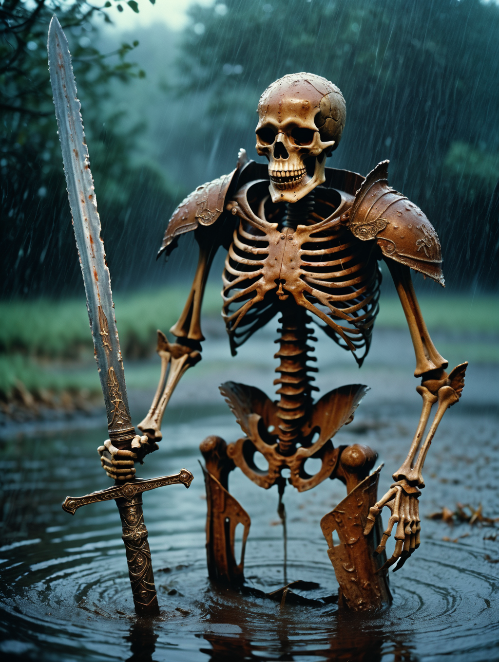 low quality Kodak 1990s amateur Kodak photo, medieval, flash photo, dark environment, closeup shot of a worn out skeleton wearing rusty armor shielding a rusted sword out of the water, extremely intricate, shot on Kodachrome, cinestill 800D, heavy rain, wet, raindrops, foggy, godrays, high contrast, film grain, halation, heavenly glow, hard shadows