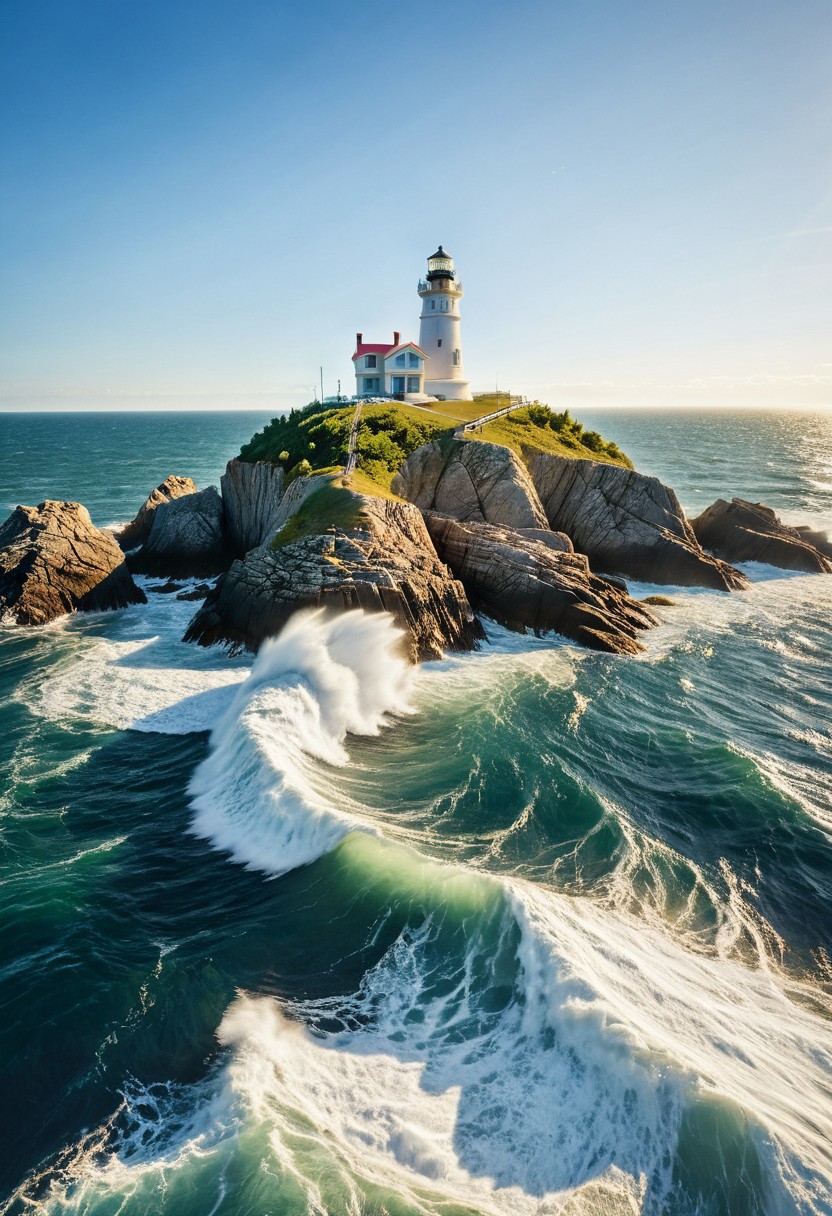 zPDXL, lighthouse, small rocky island, ocean waves, bright sunlight, national geographic, photography, (score_9, score_8_up, score_7_up, score_6_up, score_5_up, score_4_up, high res, realistic, 4k)