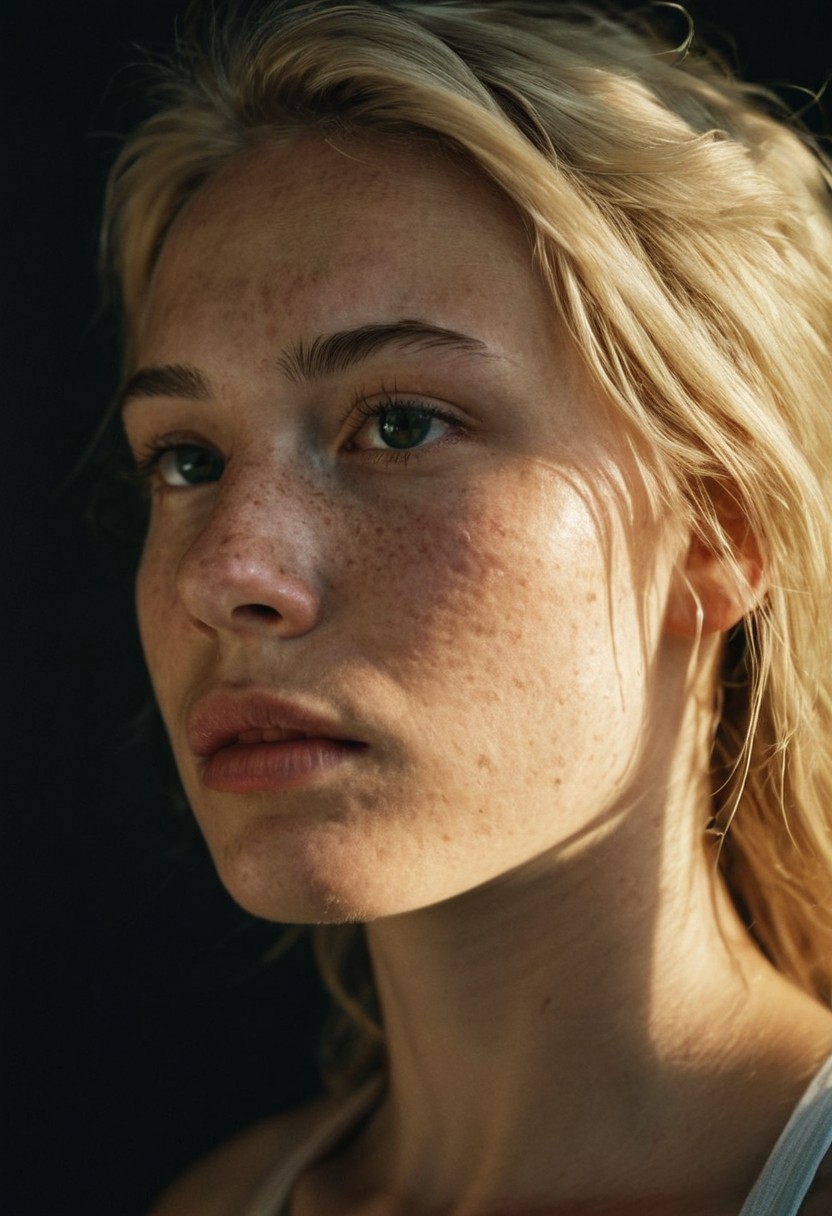 Intense, beautiful Roman female, blonde hair, sharp jawline, serious expression, profile view, closeup on face, direct lighting, hard shadows, detailed, UHD, skin pores, analog film grain, DSLR, freckles, Kodak Gold, photo-realism, dark surrounding