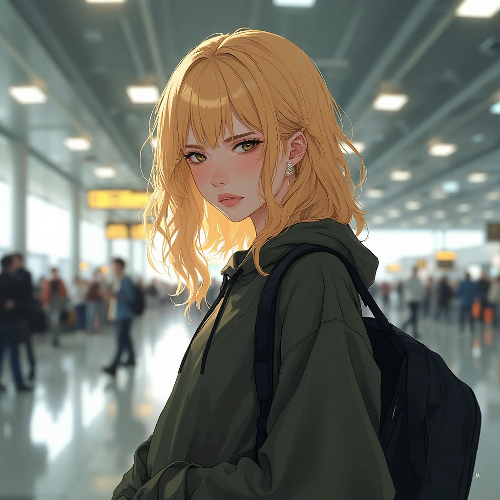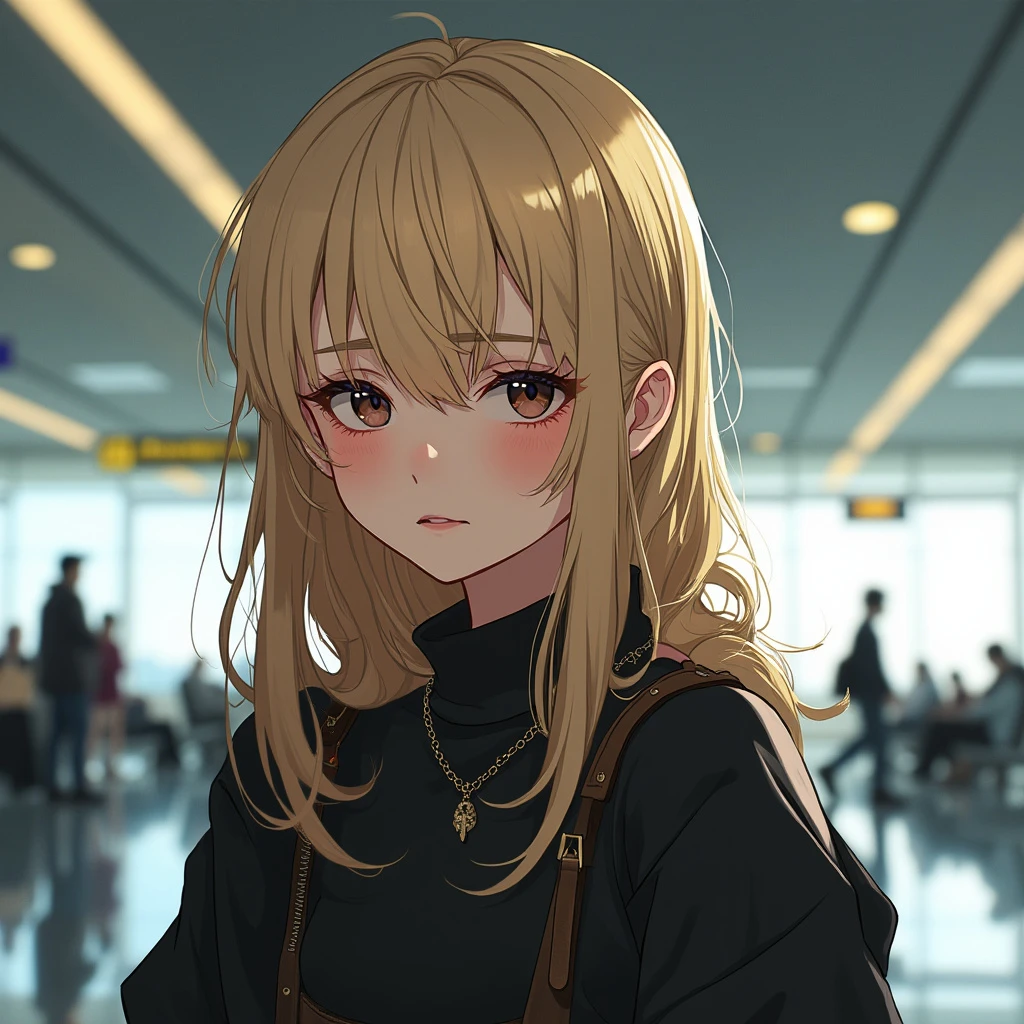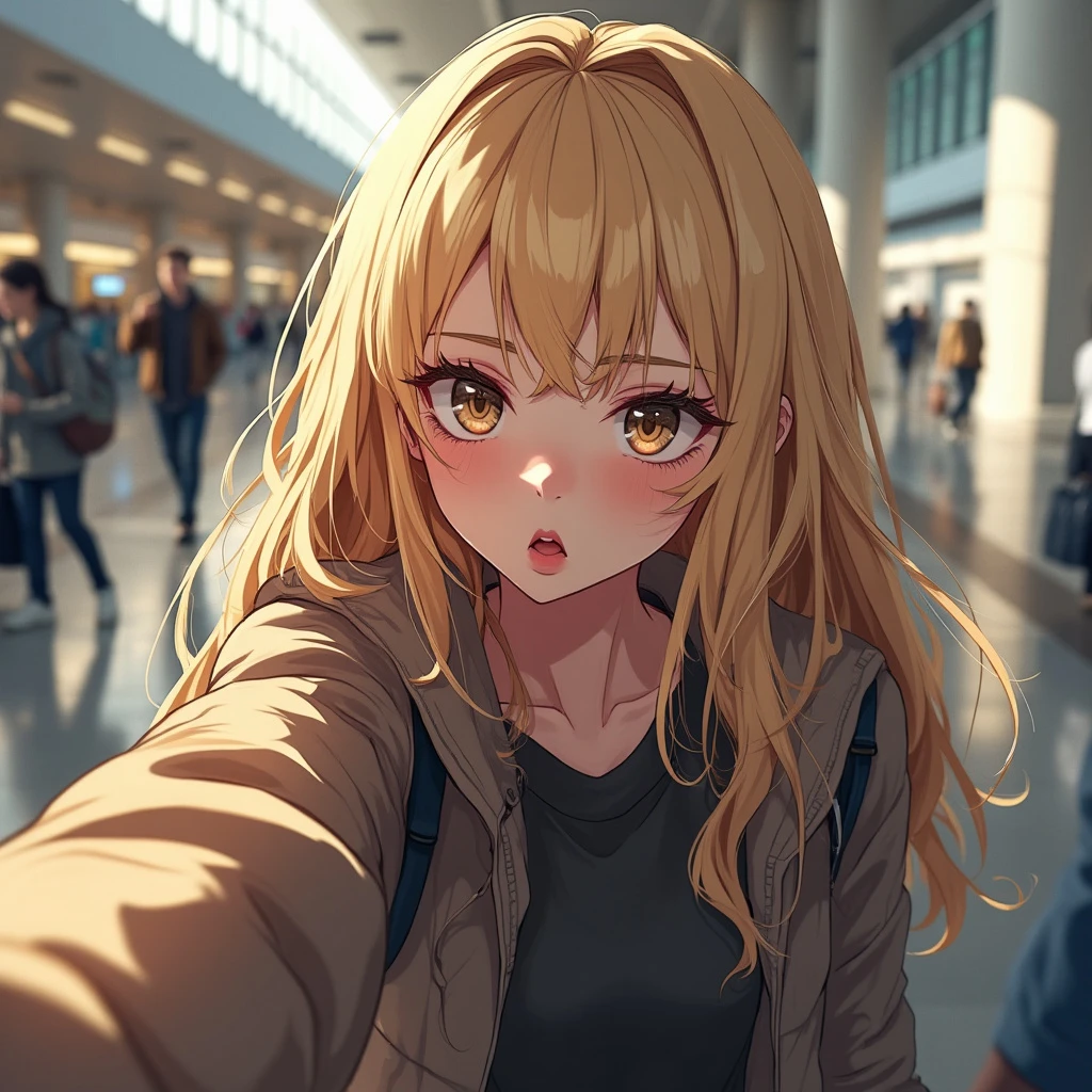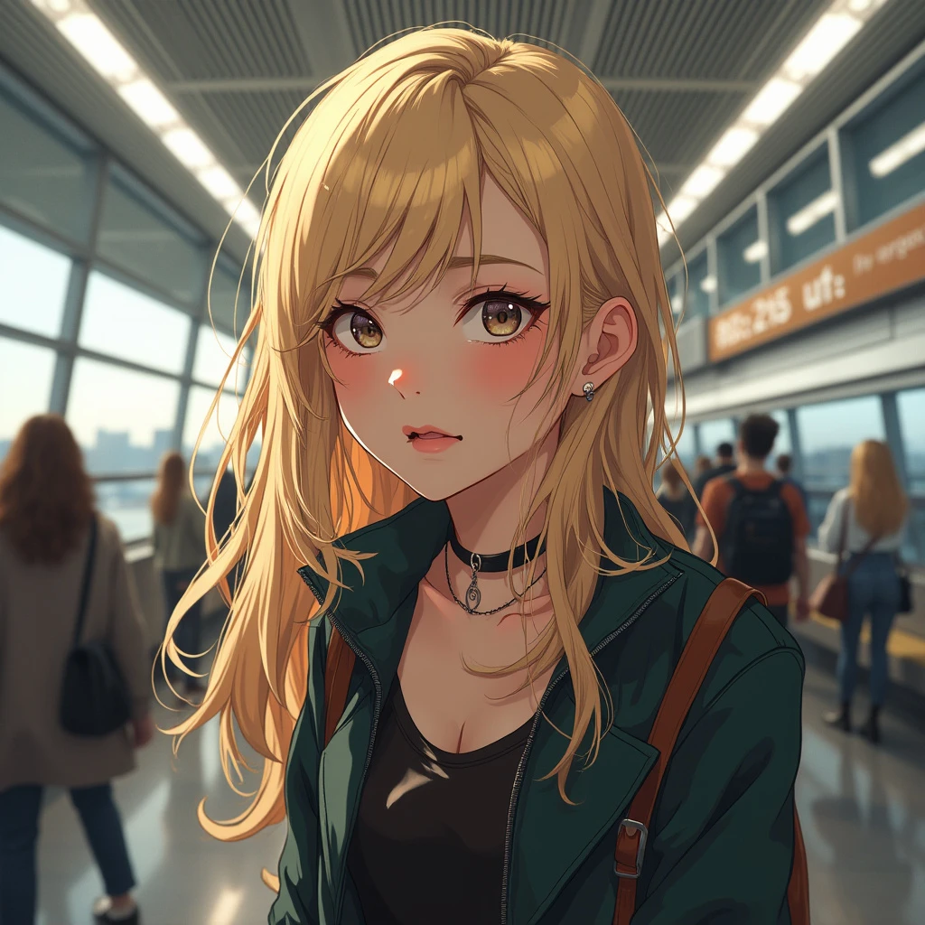 real pov view of beautiful blonde collage girl, 20 yo, in airport, photorealistic, no makeup, loose modern goth clothes, 8k HD, detailed skin texture, RAW, ultra realistic, textured skin, looking at the camera in digust