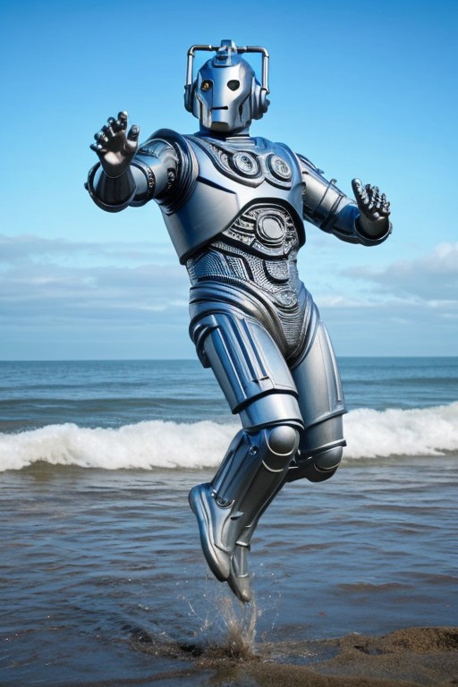 cyberman, classic cyberman, solo, beach, jump, jumping, arms wide, waves breaking in background