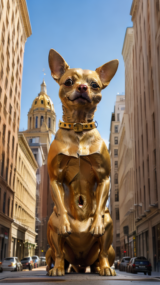 a chihuahua statue made of gold, giant, massive, 10ft_tall, in the midle of a city street, low angle shot, 4k, highres, taken with an iphone