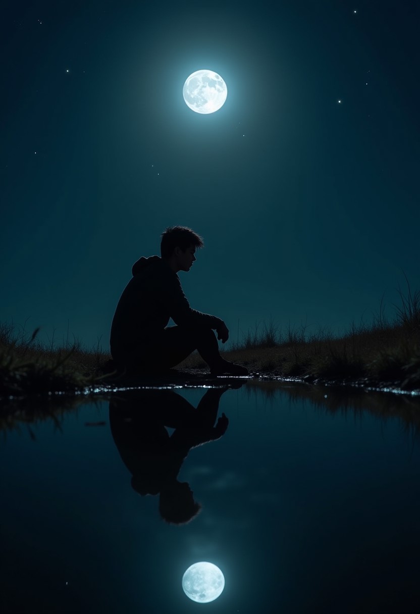 A contemplative person sits by a still pool of water at night, the scene lit by a full moon overhead. Moonlight creates a silver pathway on the water’s surface, stars twinkling faintly, the subject’s reflection mirrored perfectly, capturing serenity and solitude, extreme close-up, ethereal, silvery light.