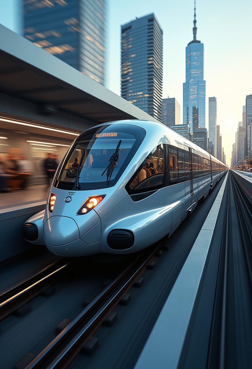 A sleek high-speed train whizzes through a futuristic cityscape. Aerodynamic design, urban skyline reflected on train windows, passengers seated comfortably with gadgets, blurred background conveying speed, elevated tracks, technological marvel, extreme close-up, bright, efficient light.