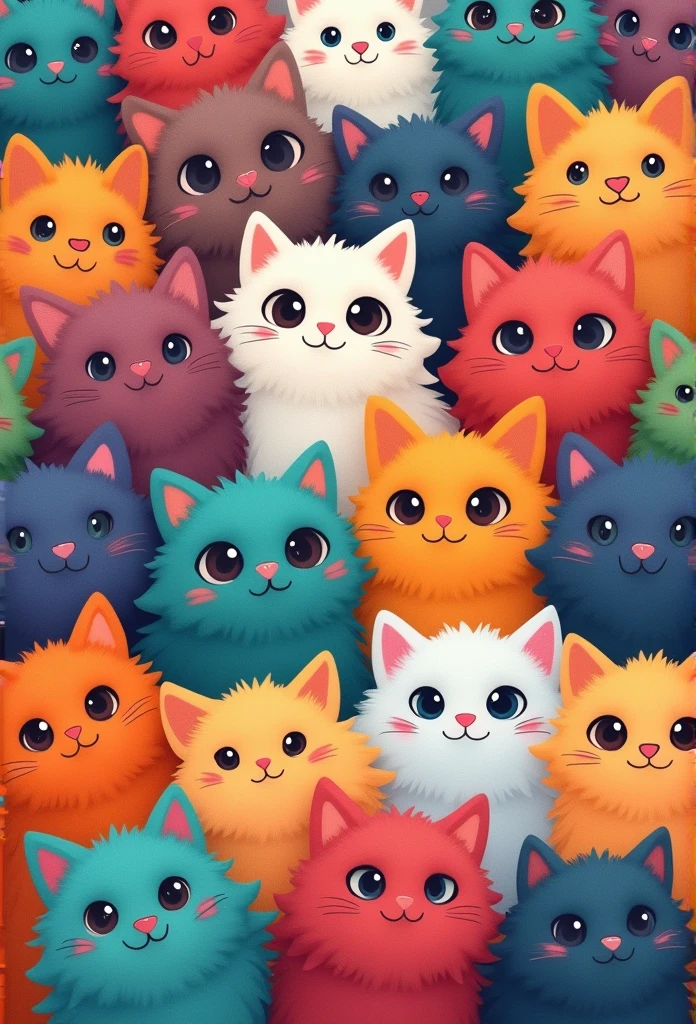 This image featuring an array of cute, fluffy cats in various colors and sizes. The cats are densely packed, creating a visually engaging and lively composition. The colors are bright and varied, with each cat exhibiting a different hue: shades of blue, orange, green, purple, red, yellow, and more. Each cat has large, expressive eyes, giving them a friendly and curious appearance. The cats are depicted with soft, fluffy fur, varying in texture and length, with some having more voluminous fur than others. The cats are arranged in a tightly packed, overlapping formation, with some cats' heads and ears peeking out from behind others, adding depth and interest to the image. The overall style of the illustration is cartoonish and whimsical, with smooth, rounded edges and a sense of playfulness. The image exudes a cheerful and joyful atmosphere, making it ideal for children's books or animations.