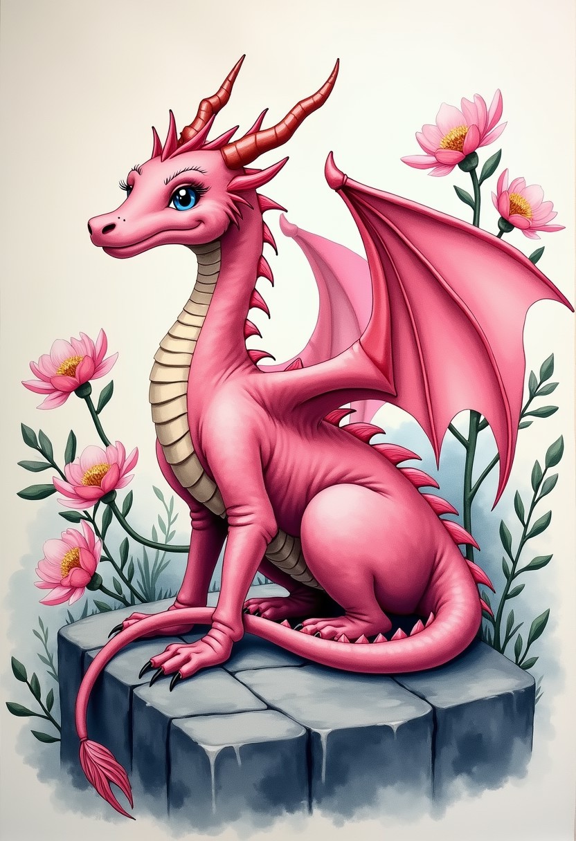 (masterpiece:1.4), best quality, watercolor, ink, oil and pencil, oil painting, there is a pink dragon on a stone by some pink flowers in the background, no humans, dragon