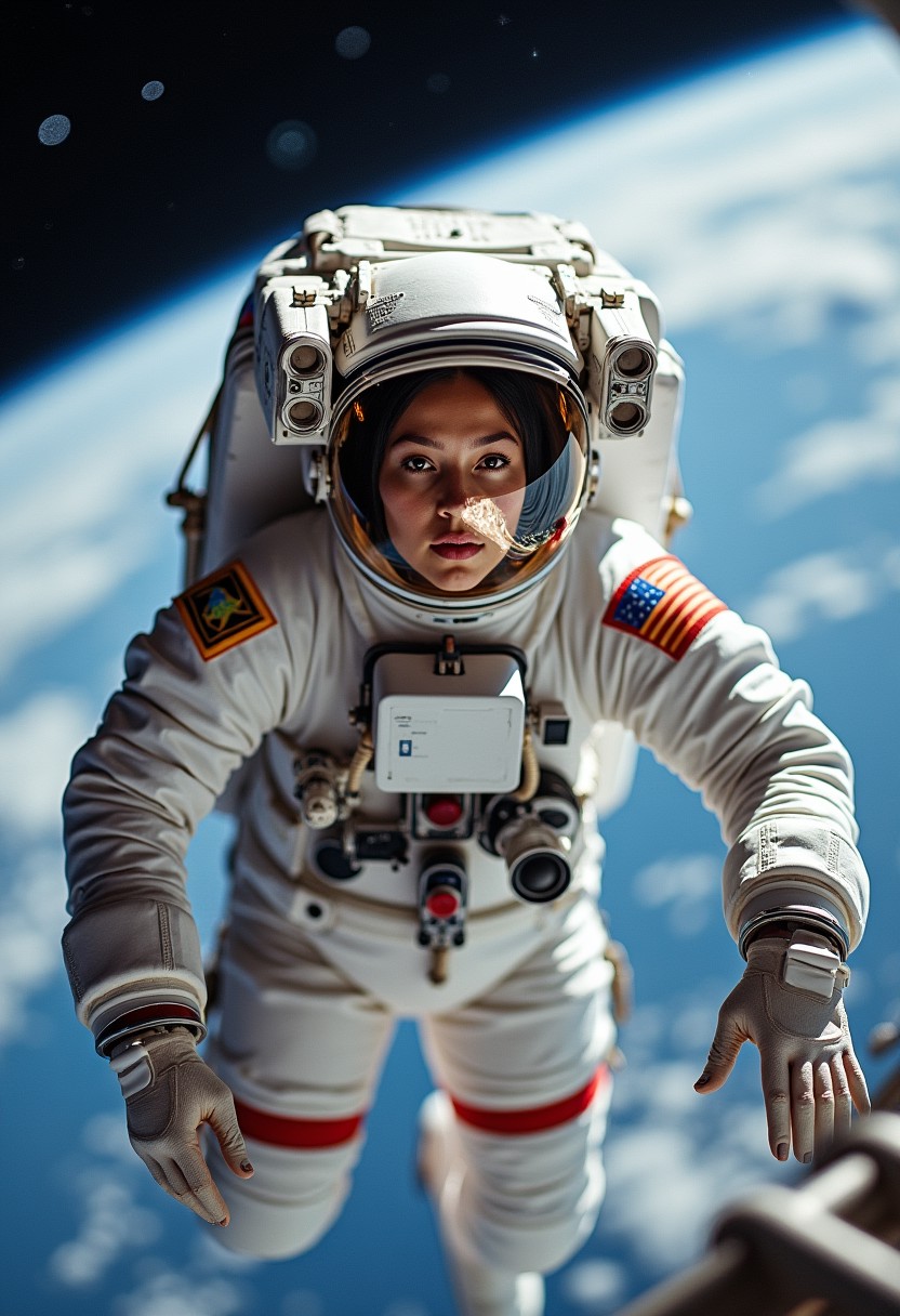 A female astronaut conducts a spacewalk outside the International Space Station. Sleek white spacesuit, Earth visible below, reflective visor, tools in hand, vastness of space, tethered to the station, steady gaze, shining stars, extreme close-up, portrait, serene, celestial light.