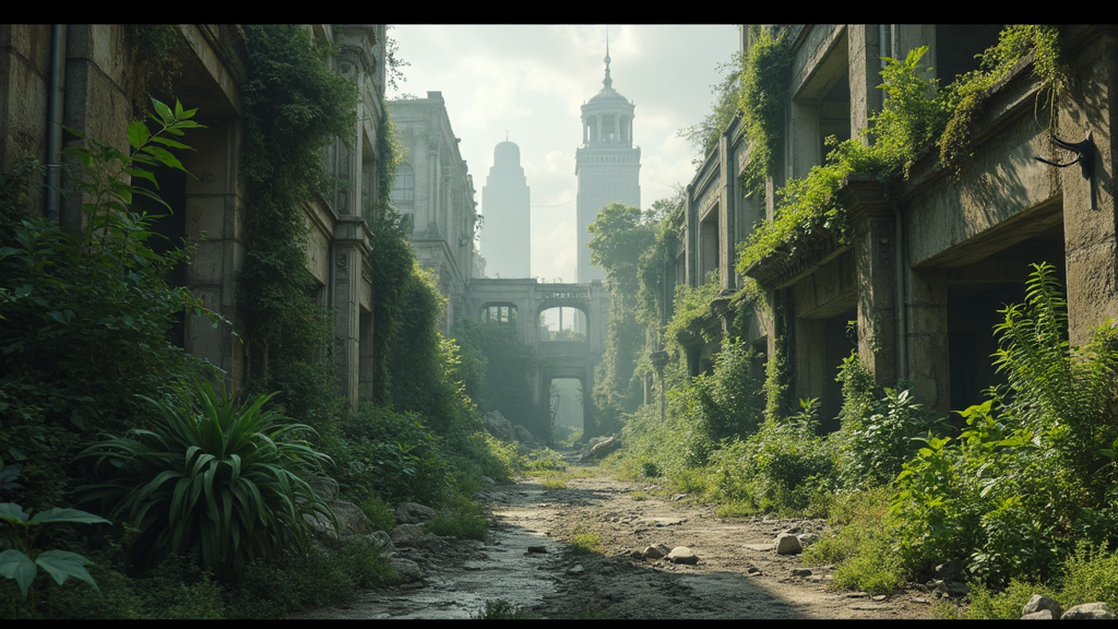 Imagine a post-apocalyptic cityscape, where nature has begun to reclaim the ruins. The scene is shot in a cinematic style, with the crumbling buildings and overgrown vegetation providing a stark contrast. The image is taken with a high-resolution camera, capturing the intricate details of the decaying architecture and the vibrant greenery. The lighting is a mix of soft, natural light and dramatic shadows that add depth to the scene. The final image is a hyper-realistic, ultra-detailed snapshot of this dystopian concept art. –ar 16:9 –v 5.2 –style raw