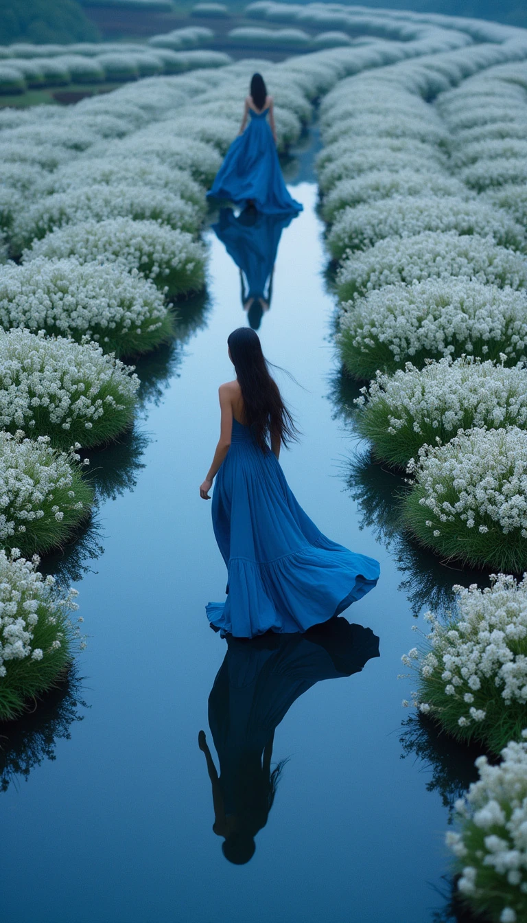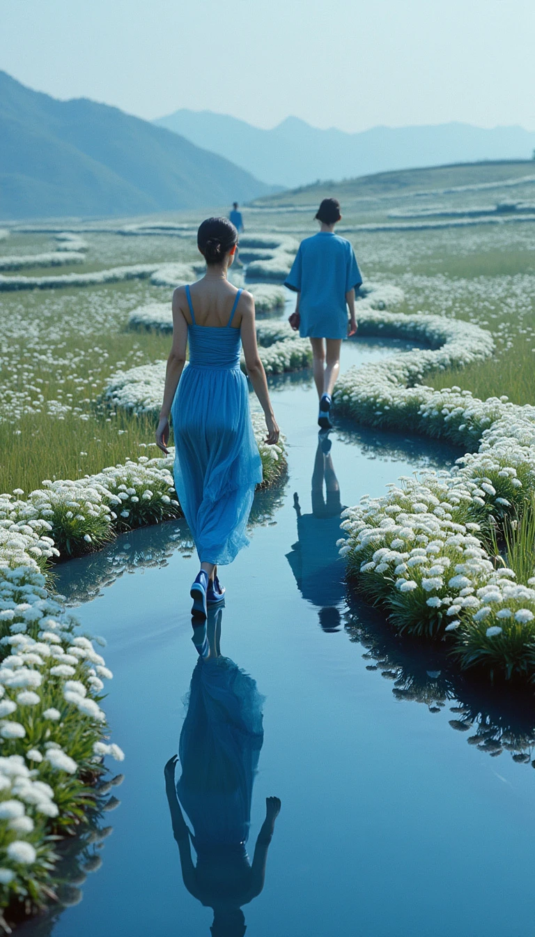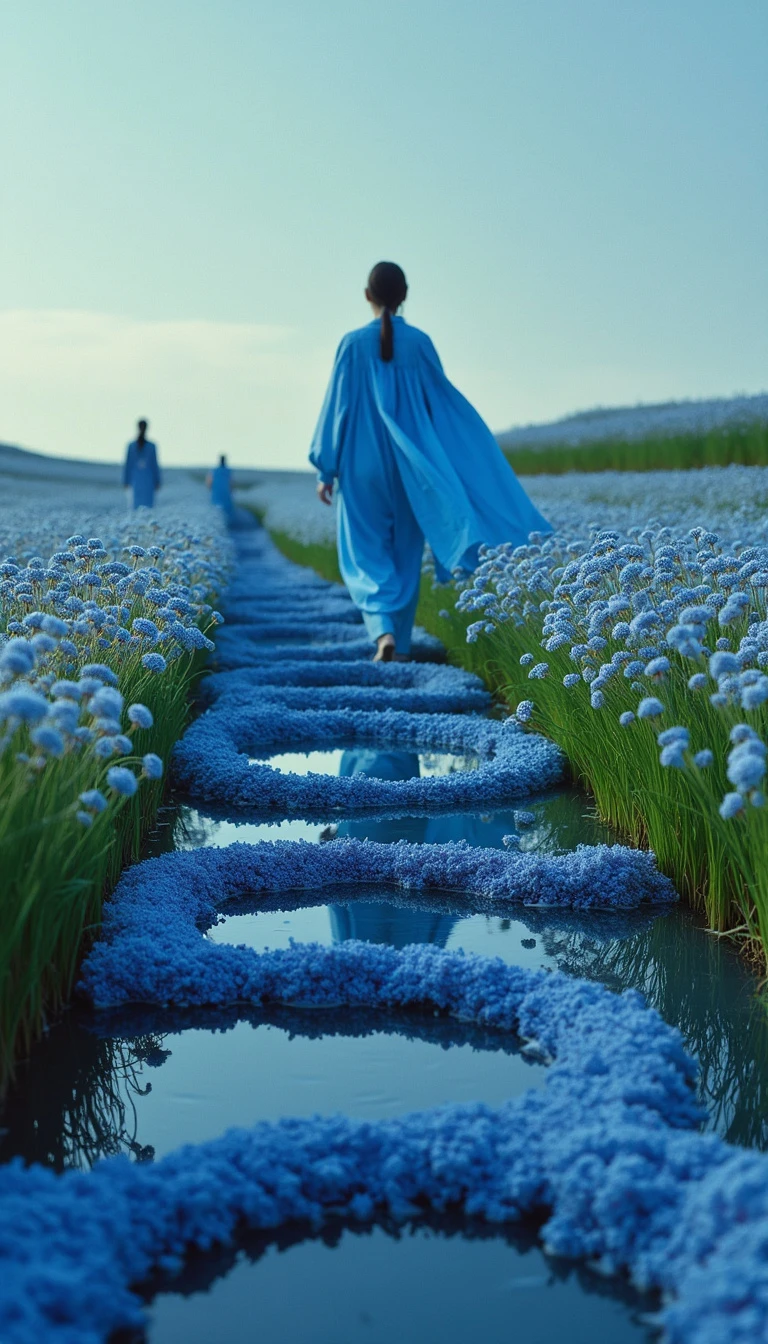 Portrait fashion editorial for Louis Vuitton, in Seoul, Jeju Island, Mimosa flowers, long exposure, people model chasing each other, movement, floating indigo fabric, walking down reflected steps of circular pools of fluffy flowers, soft, indigo, green, pink, rice fields, in the style of contemplative minimalist abstractions, maze-like, catwalk walkways, subtle use of color, heaven, sky, Kodak Portra 400. Isn’t this so beautiful? Still in love with you, lily pads, in the style of Rothko, Annie Leibovitz.