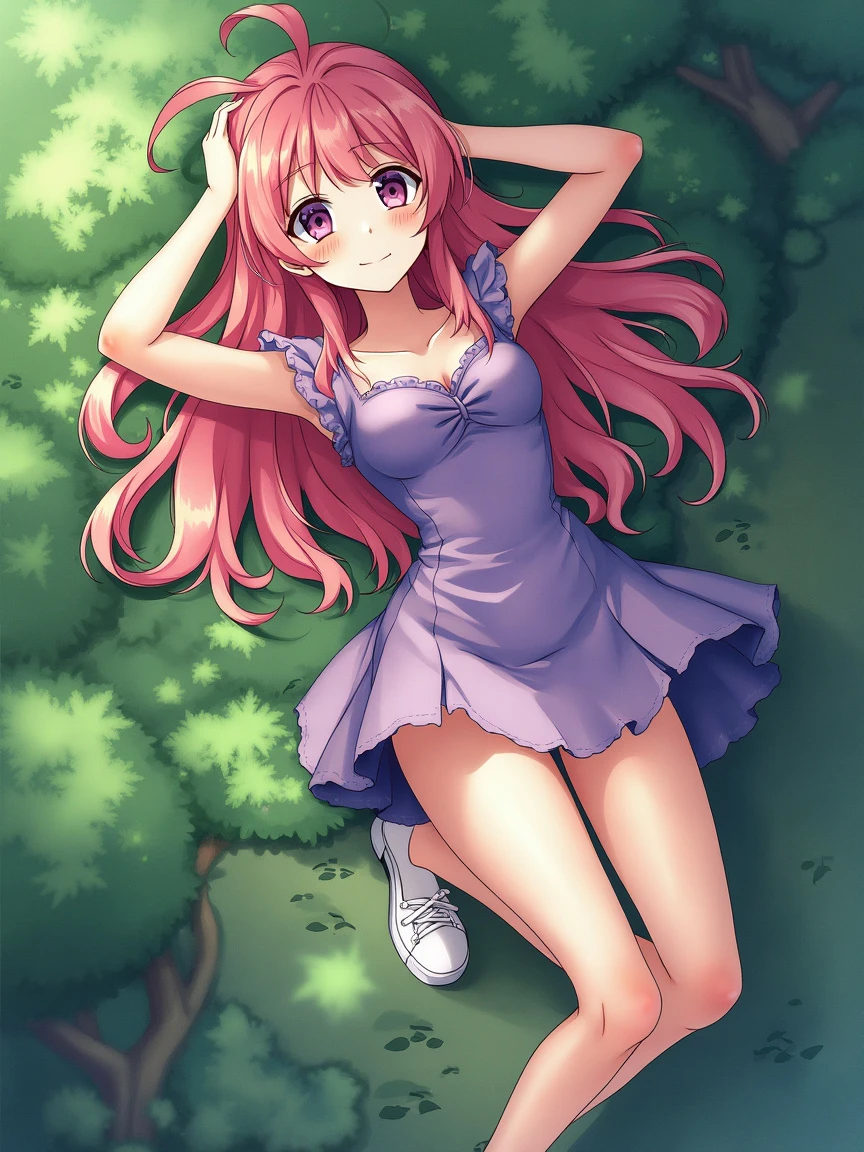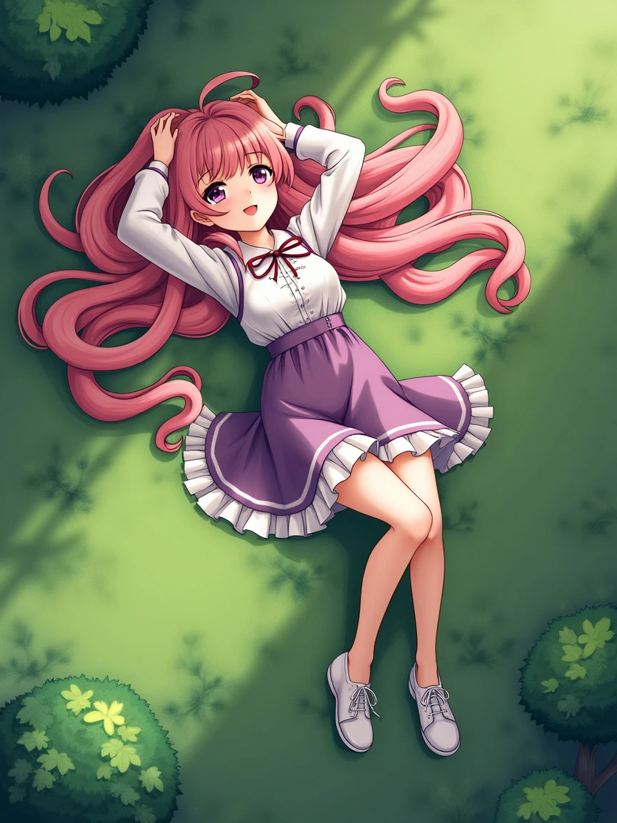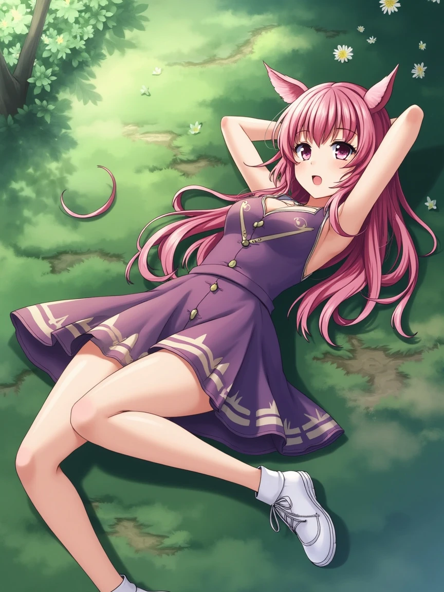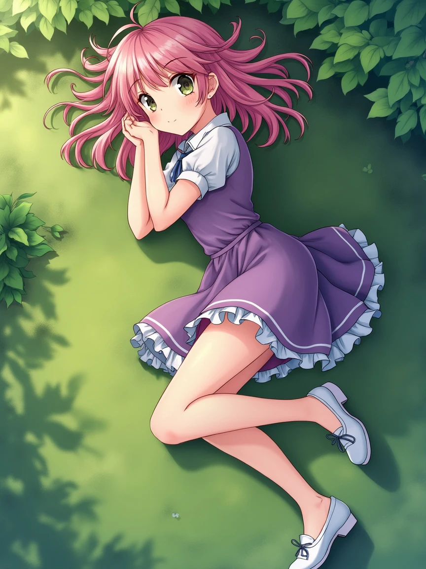 Beautiful girl with pink hair lying on her side, wearing a short purple dress and white shoes, hands under her head, a green landscape in the background, detailed face, full-body portrait, realistic style, fantasy