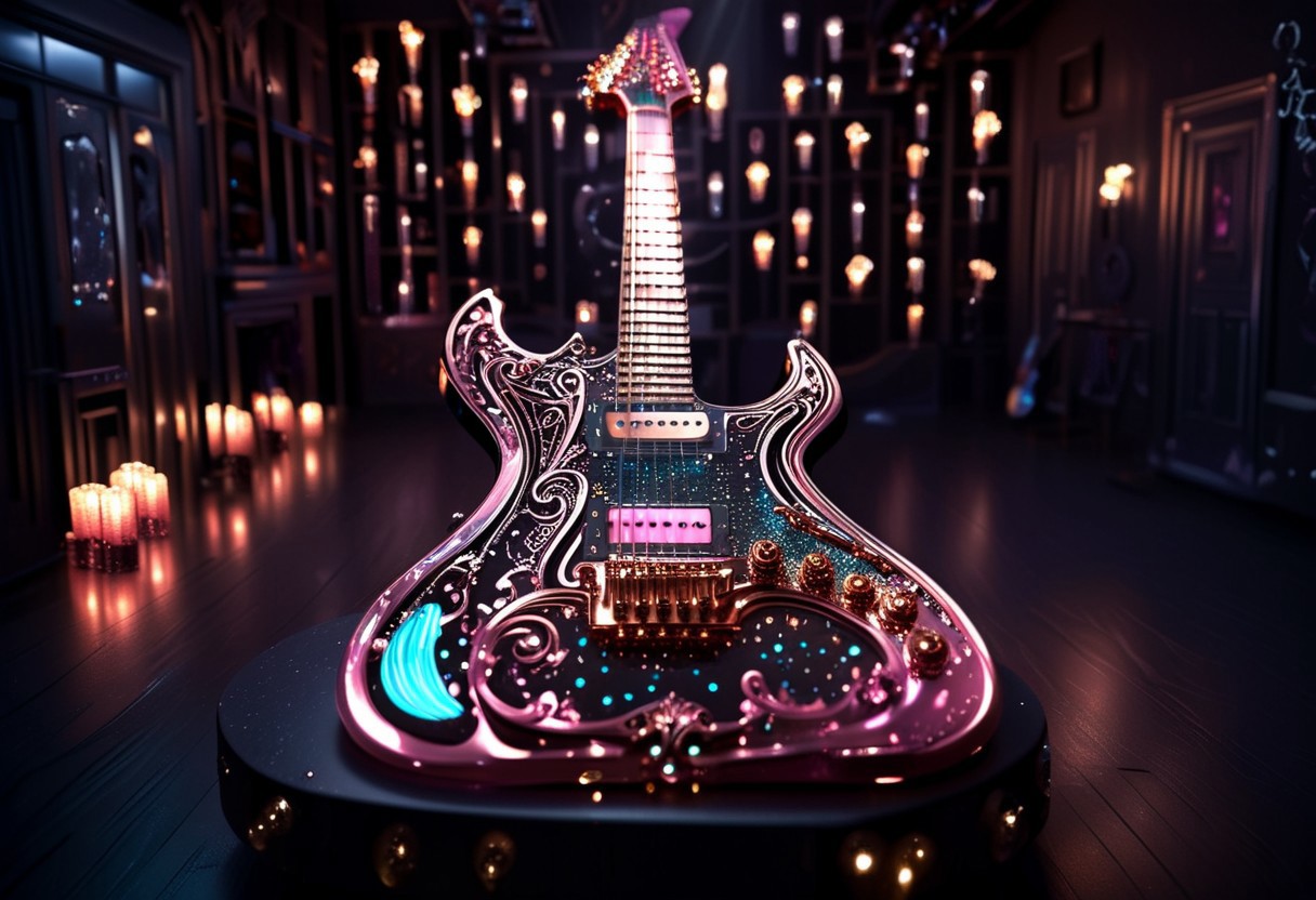 RAW photo of a very detailed reflective guitar with whimsical elements, completely dark studio, full of mirrors and few candles, magical glowing guitar,( the room is dark:2), only light of source is coming from the guitar, cyan and pink neon, strong highlights, complimentary colors, reflective enviroment, spot lights, futuristic style, 90% black and 10% gold colors, big white diamonds on the guitar, strong depth of field, darkness, dramatic light, dusty black theme, intricate details, ultra sharp, exquisite detail, flawless composition, vivid colors, masterpiece, exciting background, timeless elegant and Exquisite