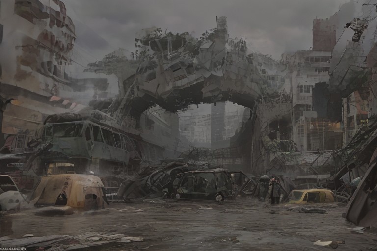 post-apoc, ruined underground metro station, nuclear apocalypse, fires, ruined_cityscape, sunset, destroyed cars, postapoc_raider, flooded tunnels