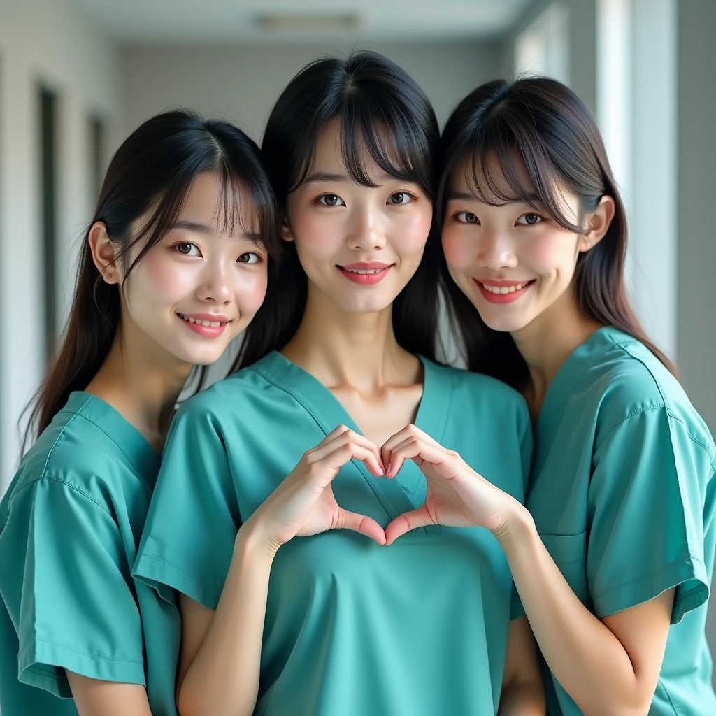 photograph, three beautiful Japanese female nurses doing fingerheart pose, slim, hourglass, teal scrubs, beautiful detailed face, black hair, pale skin, fair skin, realistic skin, detailed cloth texture, detailed hair texture, Perfect proportion, accurate, Anatomically correct, Highly detailed face and skin texture, private modern hospital room, looking at viewer, asian face , perfect anatomy