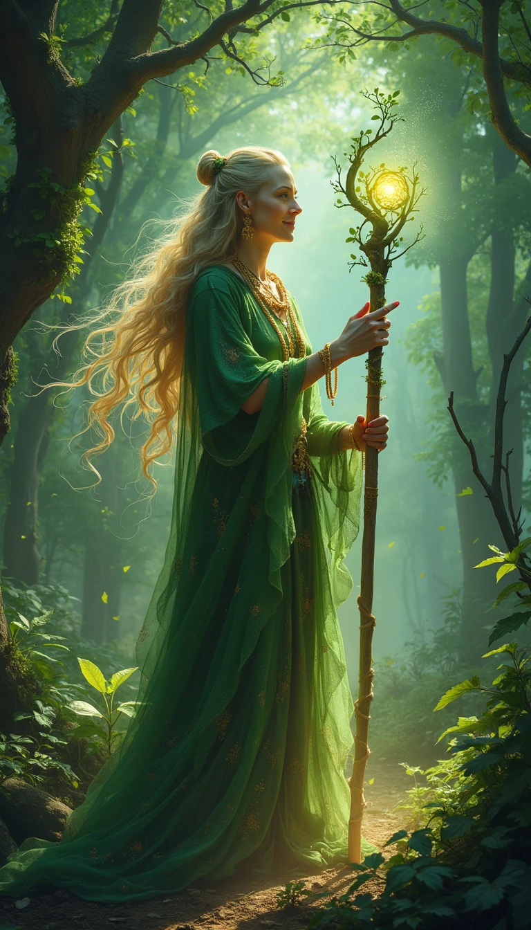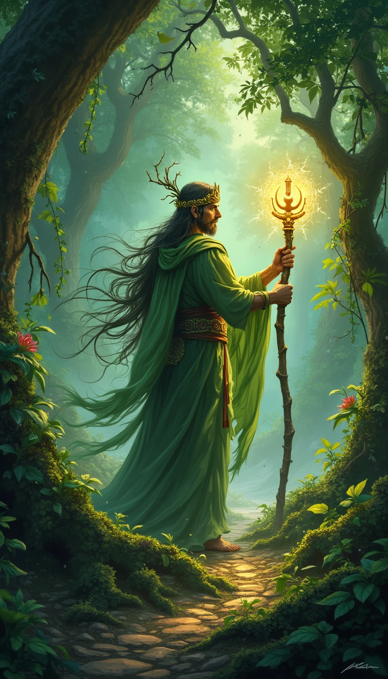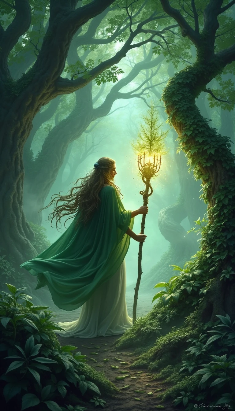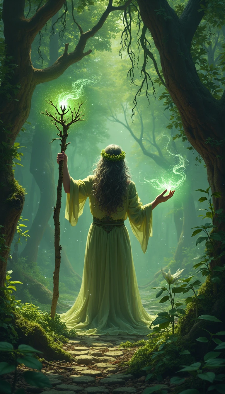 Deep within a mystical forest, a druid channels the forces of nature. Leaves and vines swirl around them as they commune with ancient spirits, their staff glowing with ethereal energy. The balance of life and magic hangs in the air