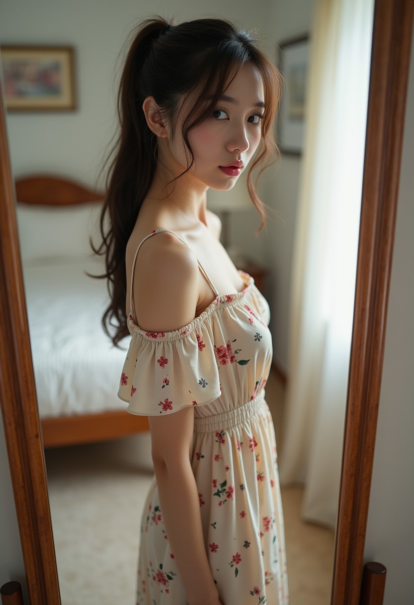 score_9, score_8_up, score_7_up, real life photo, detailed, morning, thick Collar, looking at viewer, film grain, raw, wearing thin dress, pastel flowers patern summer dress, sandal heels, amateur, traditional media, raw, 1girl, college girl, horny, brunette, ponytail, shy, flustered, cute, tiny body, slim waist, beautiful, grey eyes, soft makeup, pale skin, medium breasts, standing in bedroom, seductive pose, mirror selfie, selfie leaks (skin pores:1.2), (moles:0.8), (imperfect skin:1.1)
