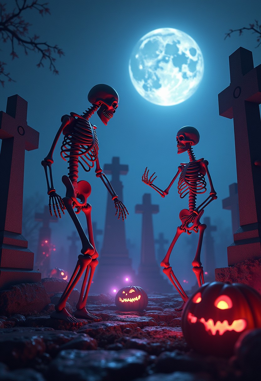 skeletons having a rave in a graveyard, tombstones, lasers, neon lights, dancing skeletons, full moon, autumn, halloween, party
