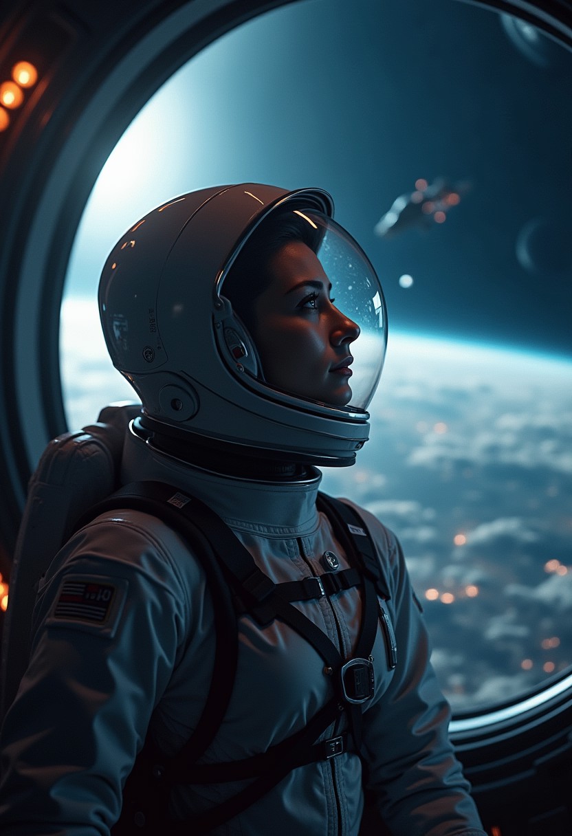 8k, deep space, beautiful woman in space suit, looking at earth from space, small space ships flying in the background