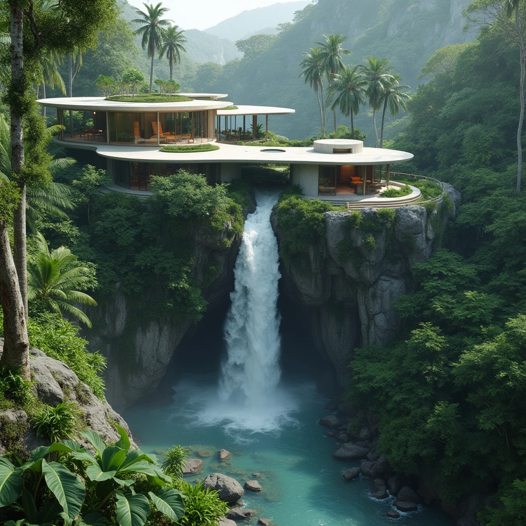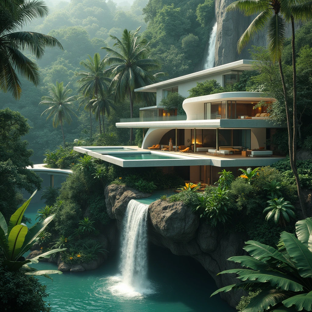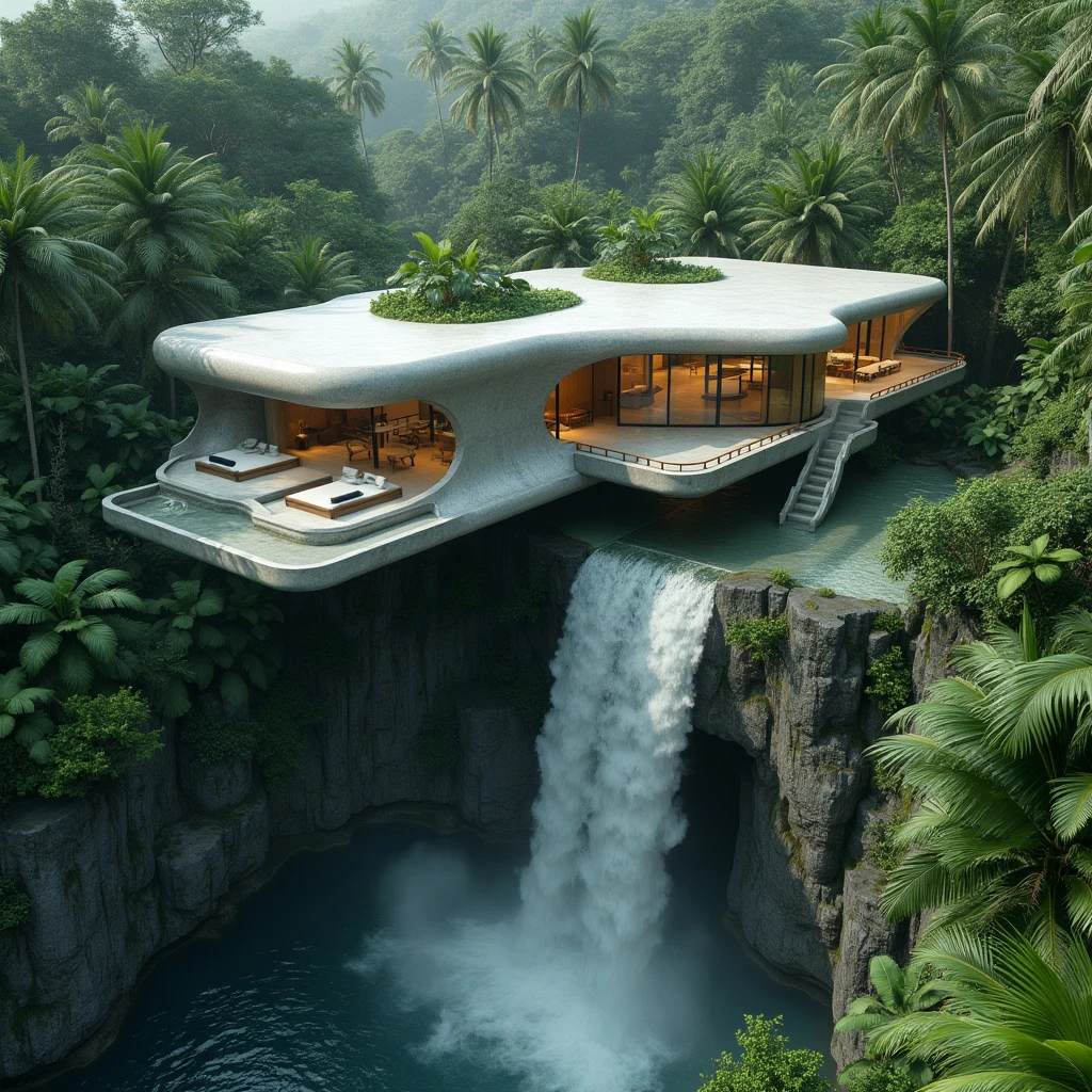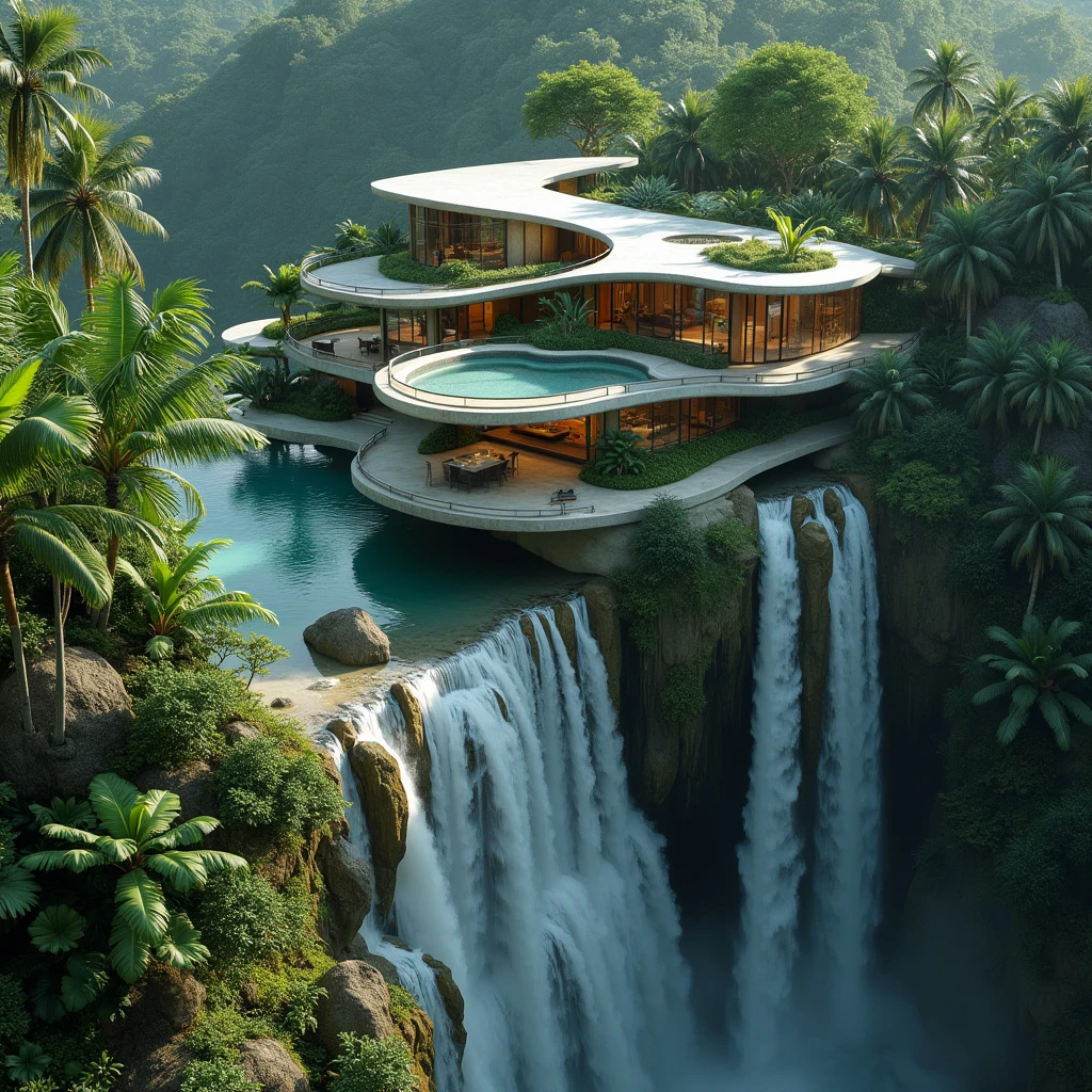 A futuristic concrete modern house on a waterfall inspired from a famous architect, with exotic luxuriant vegetation around, in a tropical jungle setting, photorealistic, a masterpiece, 4K, high details, view from above