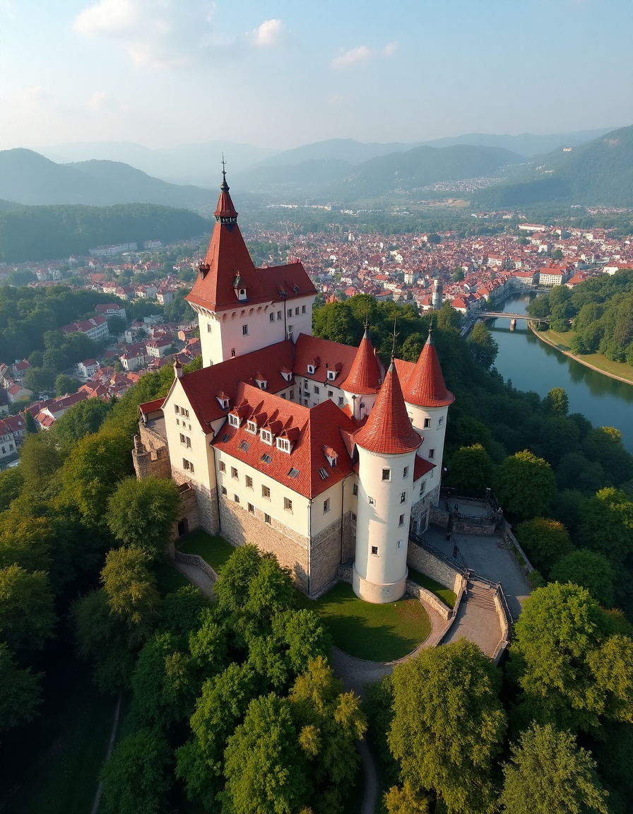 Wide angle shot of Äeský Krumlov Castle with the castle in the foreground and the town sprawling out in the background, highly detailed, natural lighting