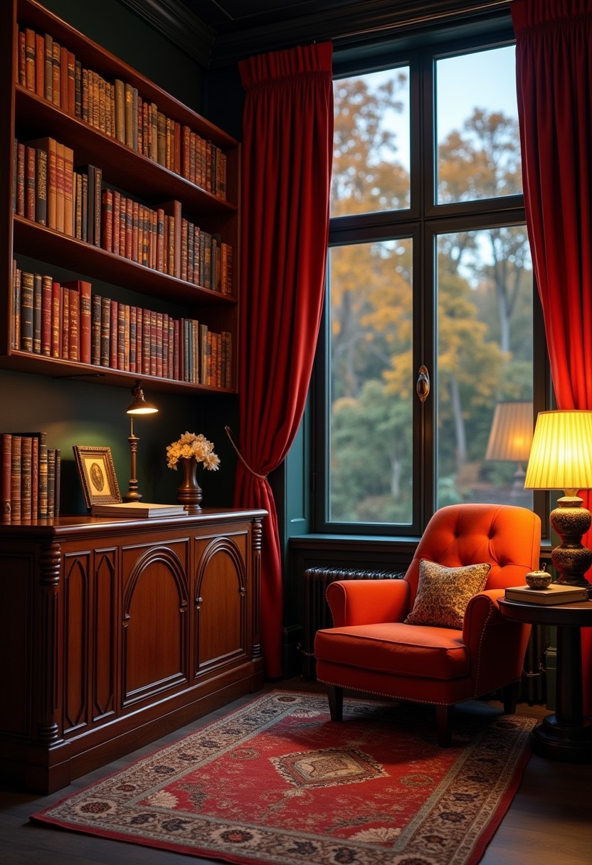 books on shelves in an art deco style study, at dusk in autumn