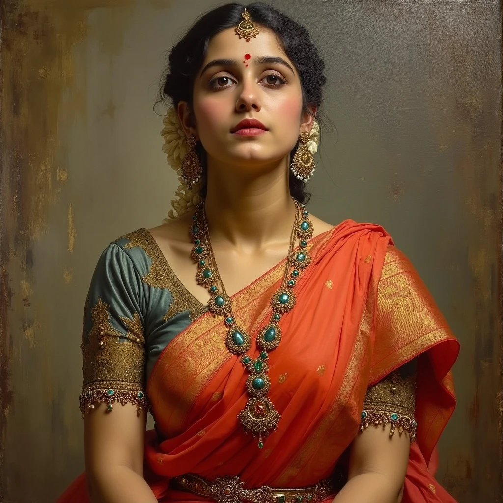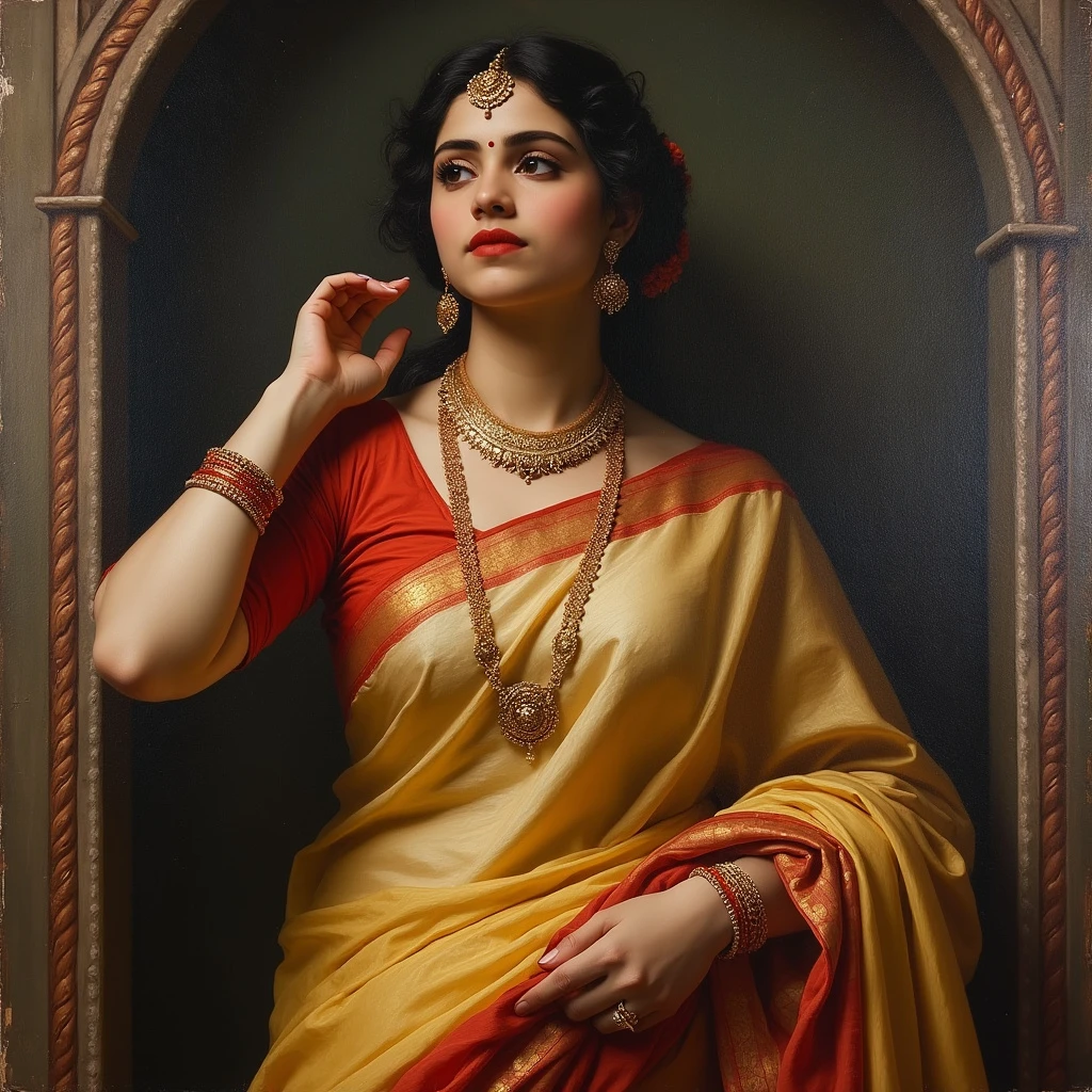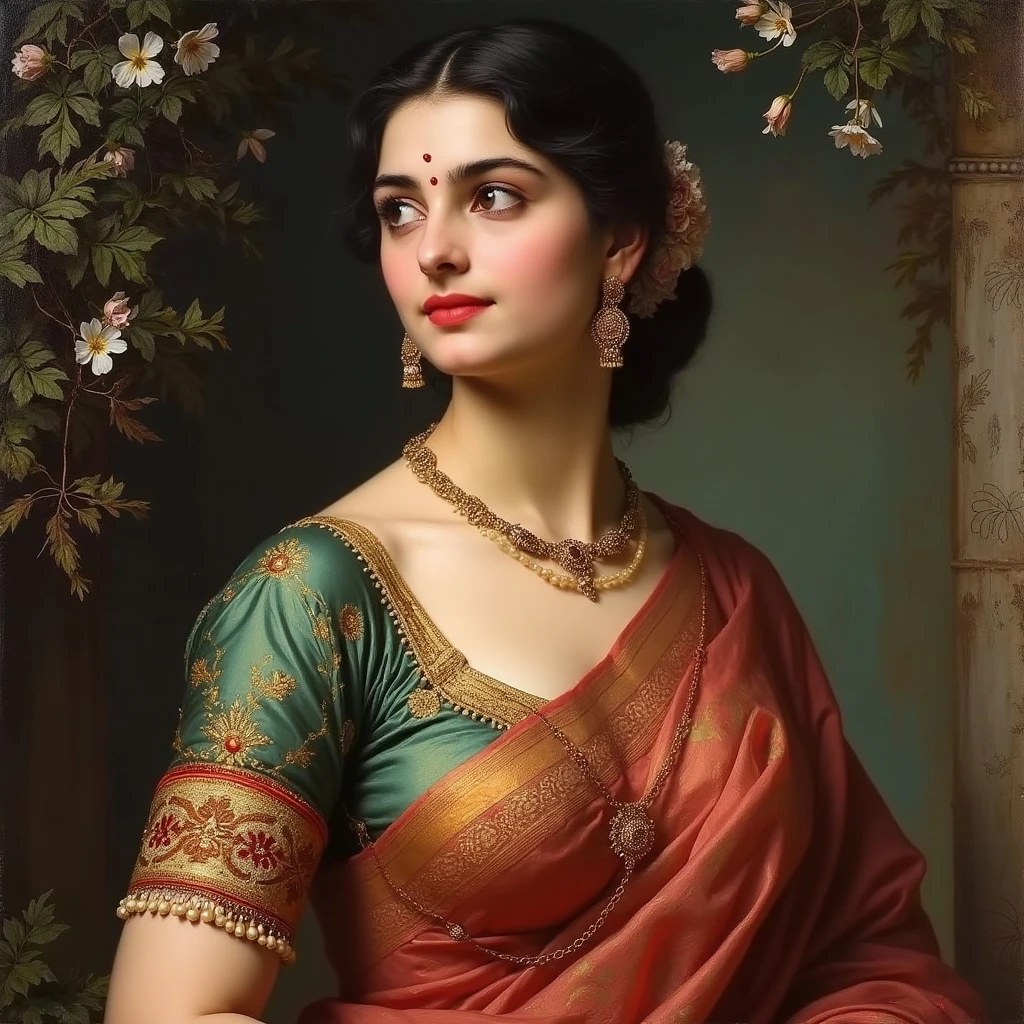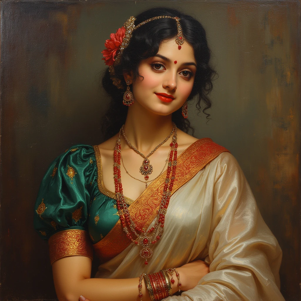 Beautiful Indian Woman, wearing saree, sari Beauty, gorgeous, Apsara, Maharani, royal queen woman, nymph from Hindu Mythology, Urvashi, matchless beauty, Highly detailed, Oil Painting by Peter Paul Rubens inspired by Raja Ravi Varma, Matchless beauty, captivating, gorgeous, heavenly beauty, celestial beauty, by Peter Paul Rubens, 13, realistic, hyper realistic, micro details, incredible artwork, insane details, ultra High resolution, 8k, 32k, acrylic on canvas, intricate, flawless, detailed, detailed face, detailed eyes, masterpiece, by Peter Paul Rubens, by Caravaggio, by William Adolphe bouguereau, perfect face, perfect body, beautiful art, realism, baroque, renaissance Art, highly textured, beautiful and detailed eyes, uhd, best quality,
