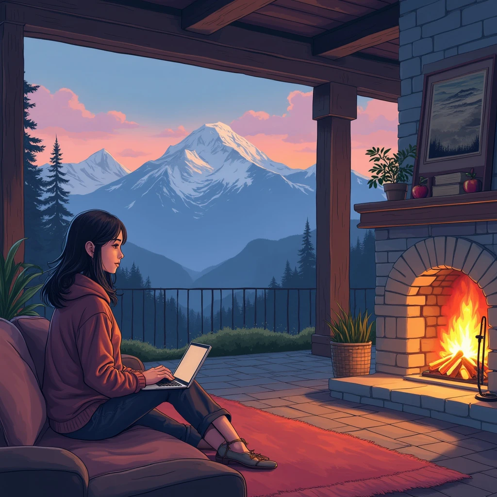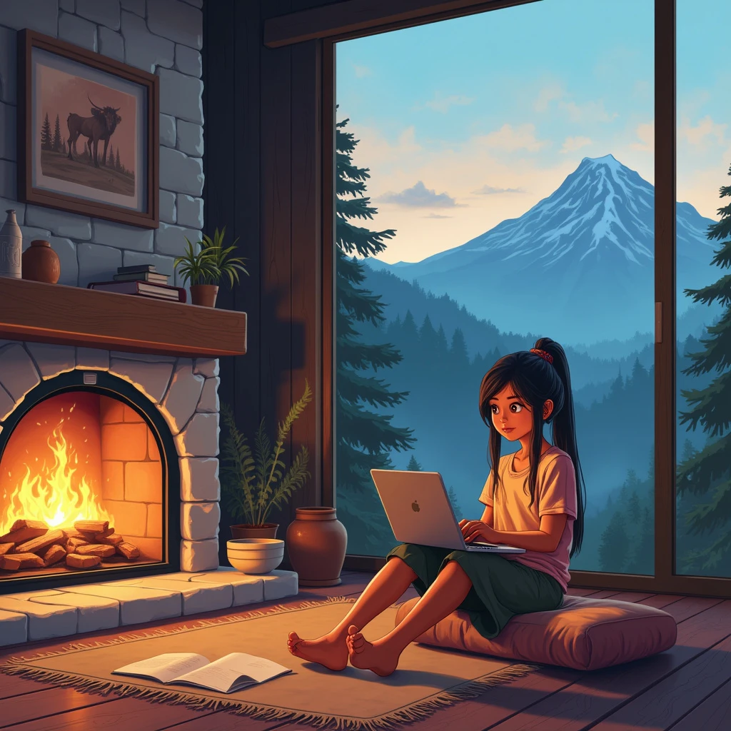 Young native girl working business plan on laptop by fire place in beautiful mansion by mountains