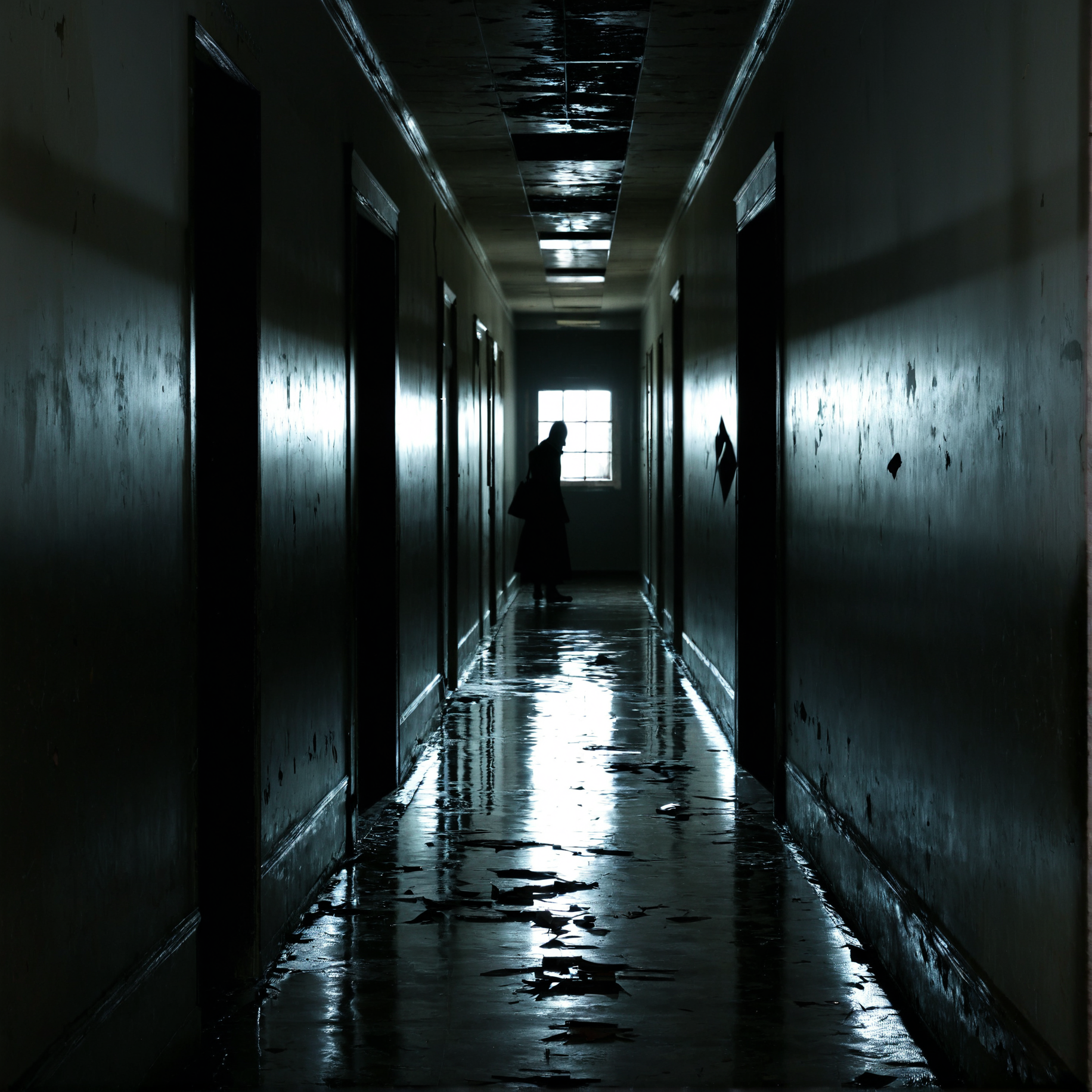 Horror-themed silhouette, horror game, shadowy figure, peeking around corner, dark, abandoned school, hallway, best quality, masterpiece, 4k, uncensored, prefect lighting, rating_explicit, very aesthetic, detailed, <lora:add_details_xl:0.6>, very detailed, <lora:SDXLHighDetail_v5:0.6> . Eerie, unsettling, dark, spooky, suspenseful, grim, highly detailed