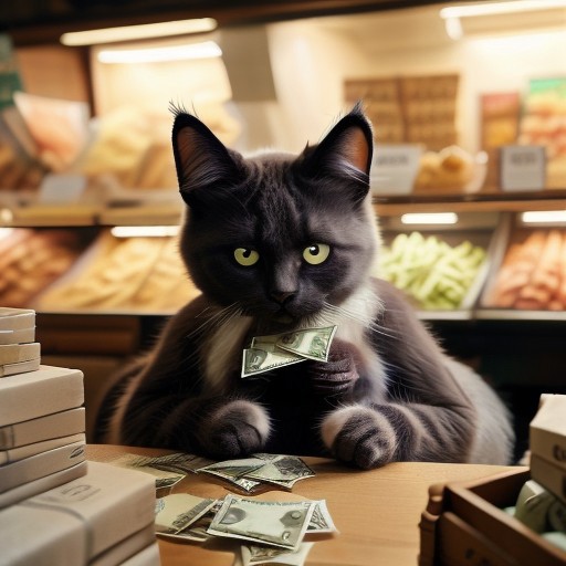 Cat, grey cat, british short hair, fluffy, stealing fish from market, shocked, taking money from customer, rameses is angry,
