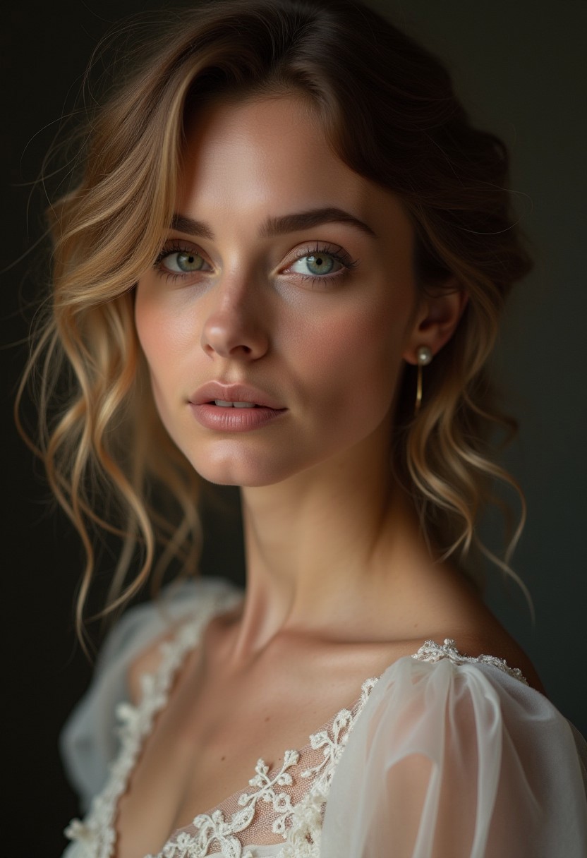 (8k, RAW photo, highest quality), beautiful (white skin woman), close up, dress, (detailed eyes:0., (looking at the camera:1.4), (high-resolution image), (best shadow) , skin textures, intricate details, interior, studio,