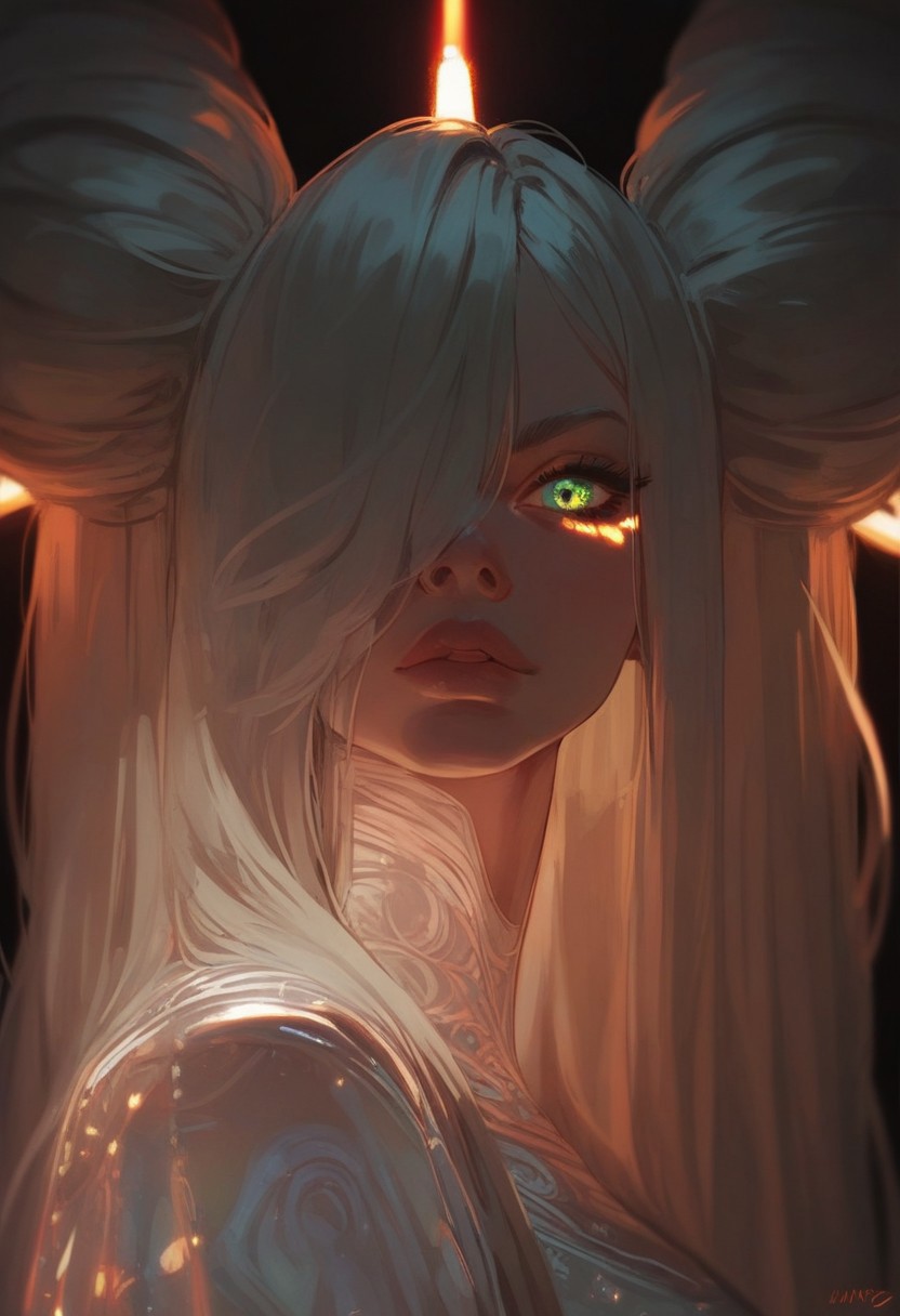 score_9, score_8_up, score_7_up, score_6_up,score_5_up, closeup, portrait, detail, (1girl:1.2), Frieren, very long hair,blonde hair,hair over one eye,one eye covered, giant massive horns, silver and blonde hair, (laser light clothes:1.3), (glowing dress:1.3), twintails, (((turns to the viewer, the view from the back))), (perfect face:1.1), green eyes,glittering, onyx dress, from side, profile, intricate complexity details, dark background