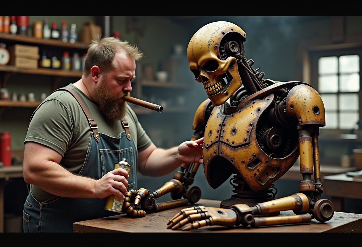 A rusty Terminator endo-skeleton war robot, in an dirty mechanics shop, an overweight mechanic in overalls in smoking a cigar and applying an oil can to the joints of the old Terminator robot, looks like he's working on repairing it and applied some anti-rusting agent to one half of the frame