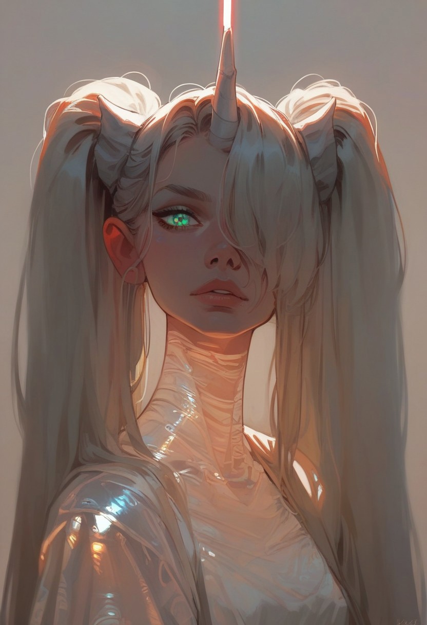 score_9, score_8_up, score_7_up, score_6_up,score_5_up, closeup, portrait, detail, (1girl:1.2), Frieren, very long hair,blonde hair,hair over one eye,one eye covered, giant massive horns, silver and blonde hair, (laser light clothes:1.3), (glowing dress:1.3), twintails, (((turns to the viewer, the view from the back))), (perfect face:1.1), green eyes,glittering, onyx dress, from side, profile, intricate complexity details, dark background