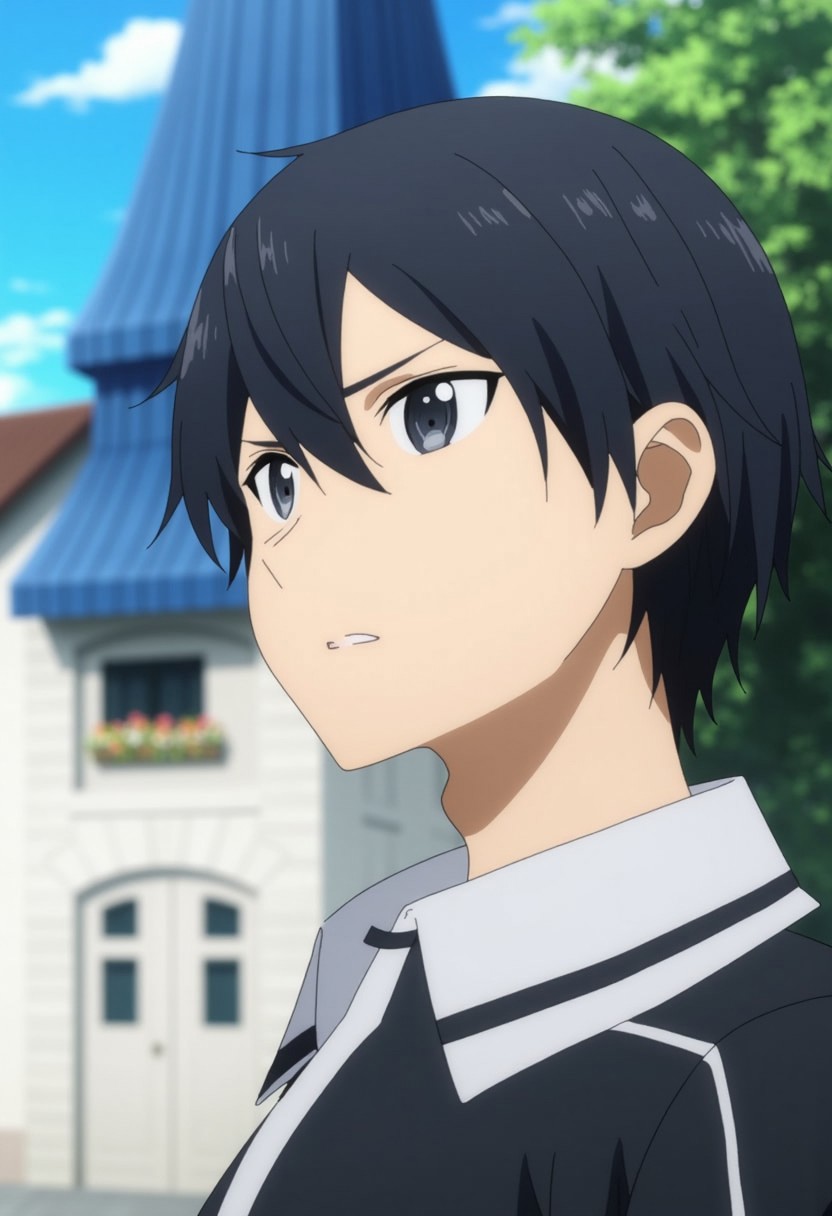 high resolution, solo, best quality, 1Boy, Kazuto Kirigaya, Black Hair, Black Eyes, portraits, proud, outdoor, Half Body, Depth Of Field,